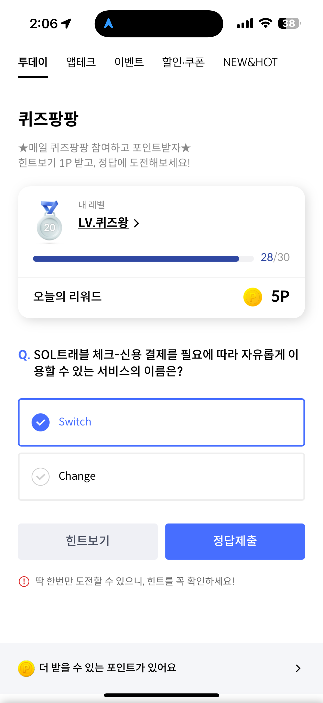 신한카드 퀴즈팡팡 정답은 Switch 입니다