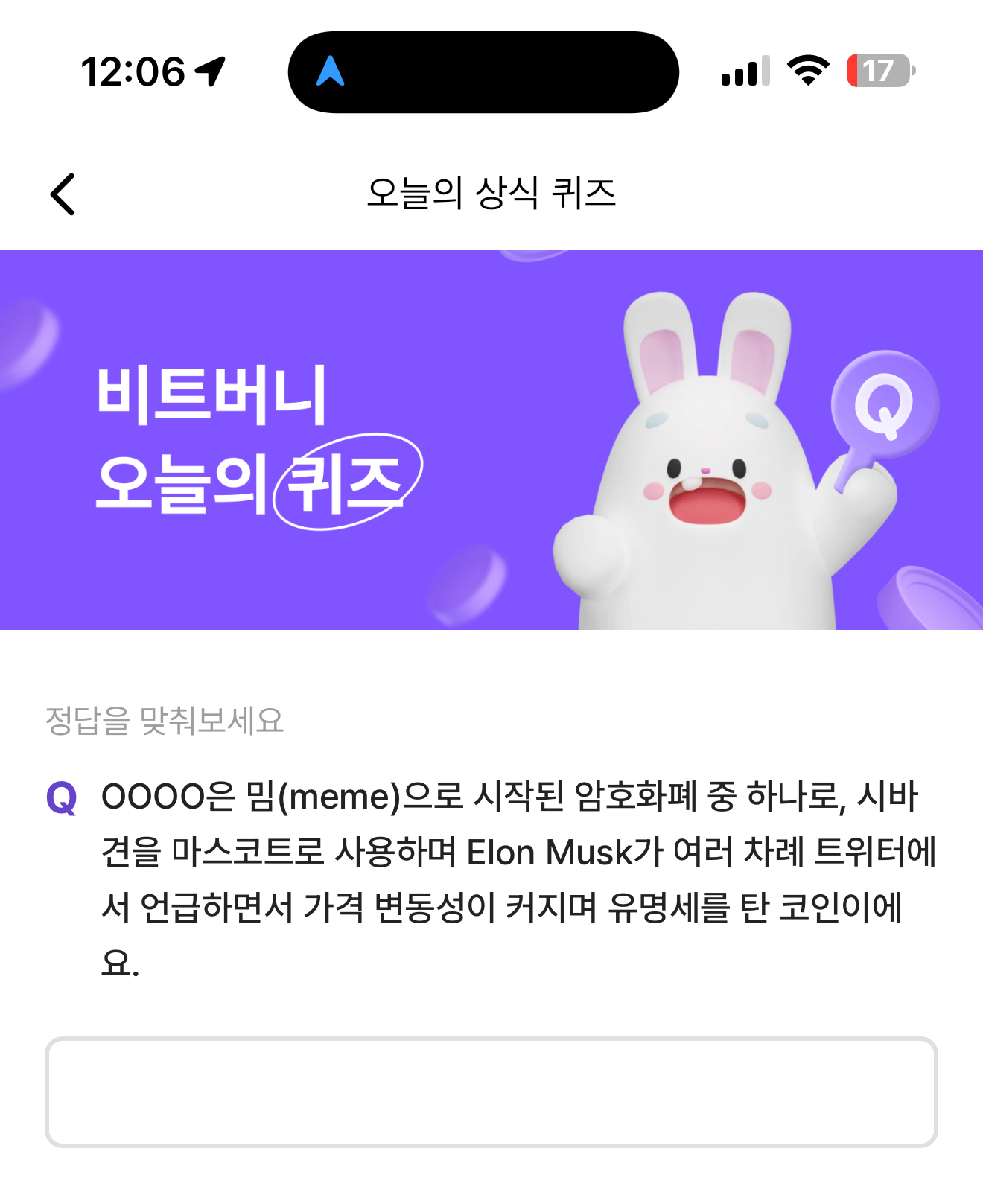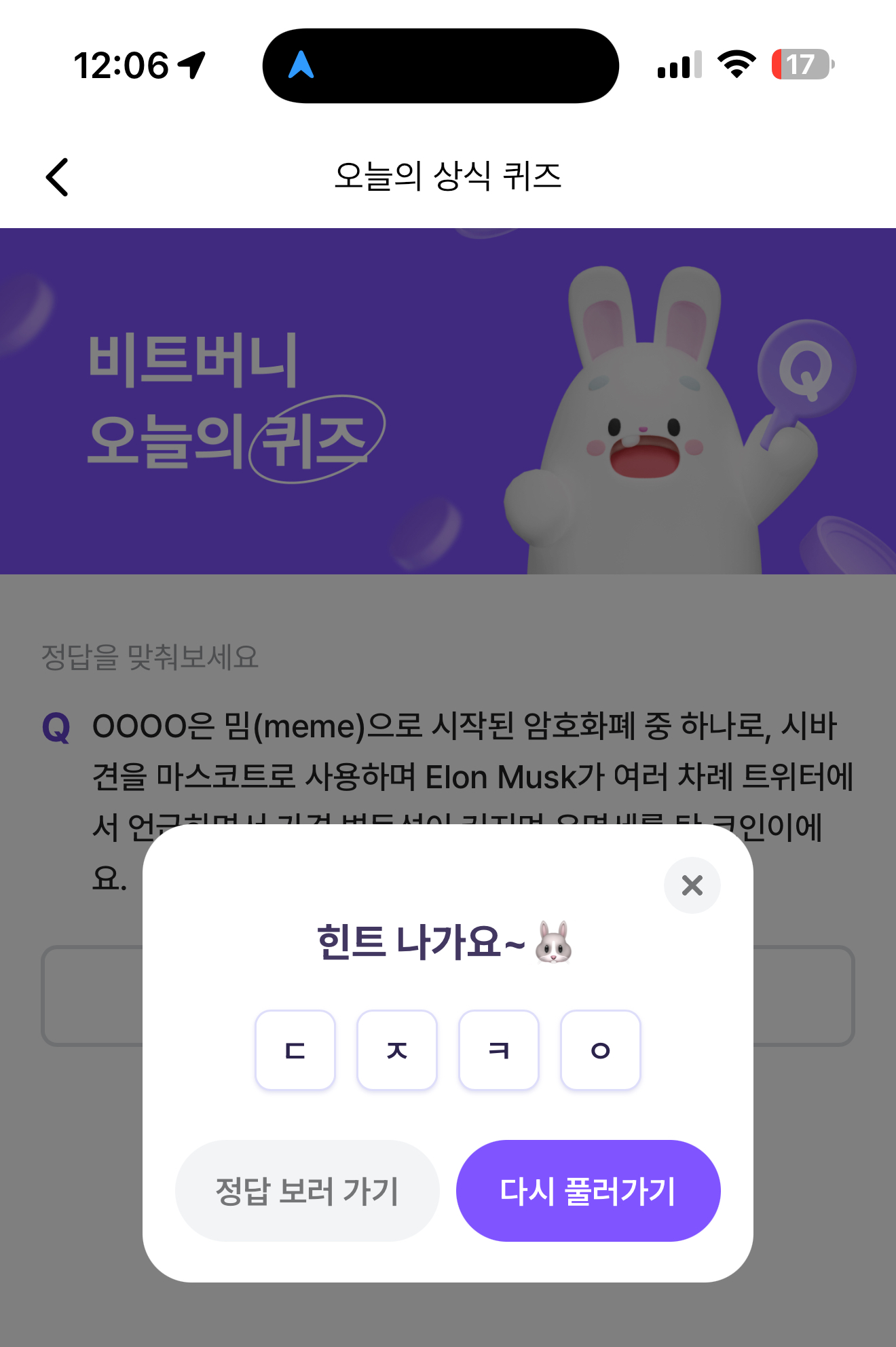 비트버니 오늘의 퀴즈 정답은 도지코인 입니다