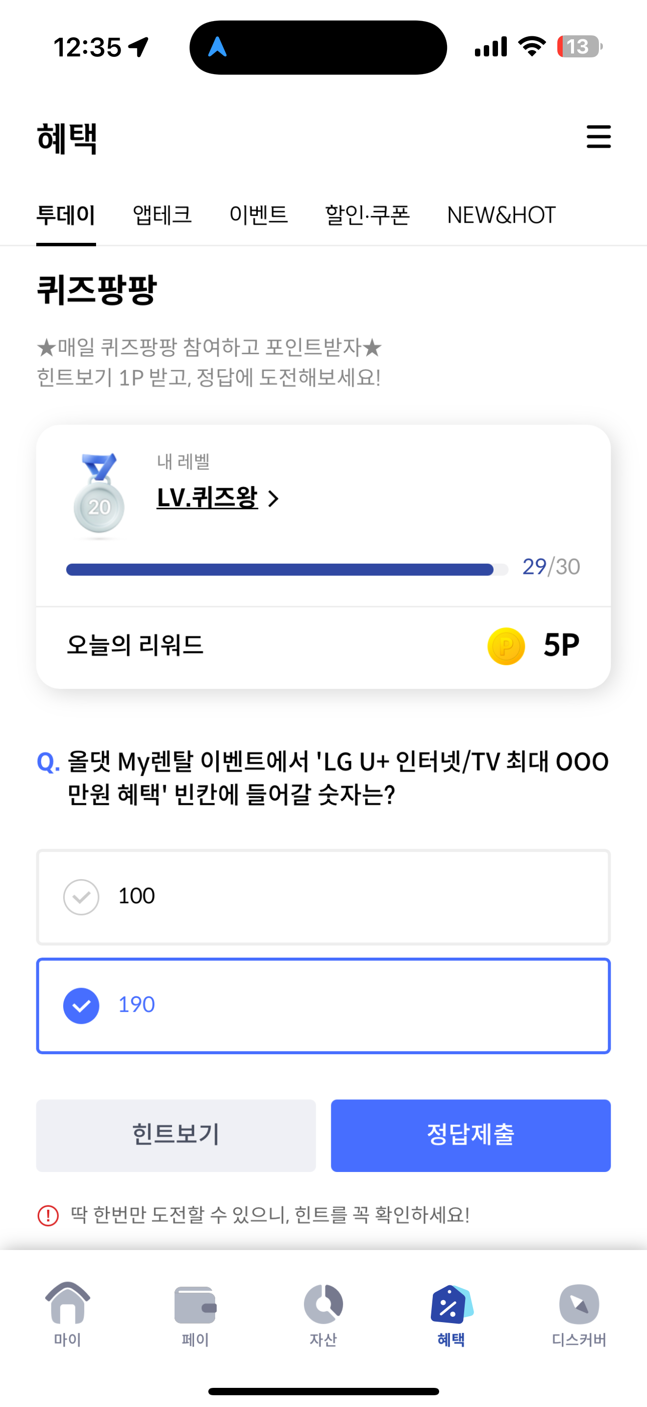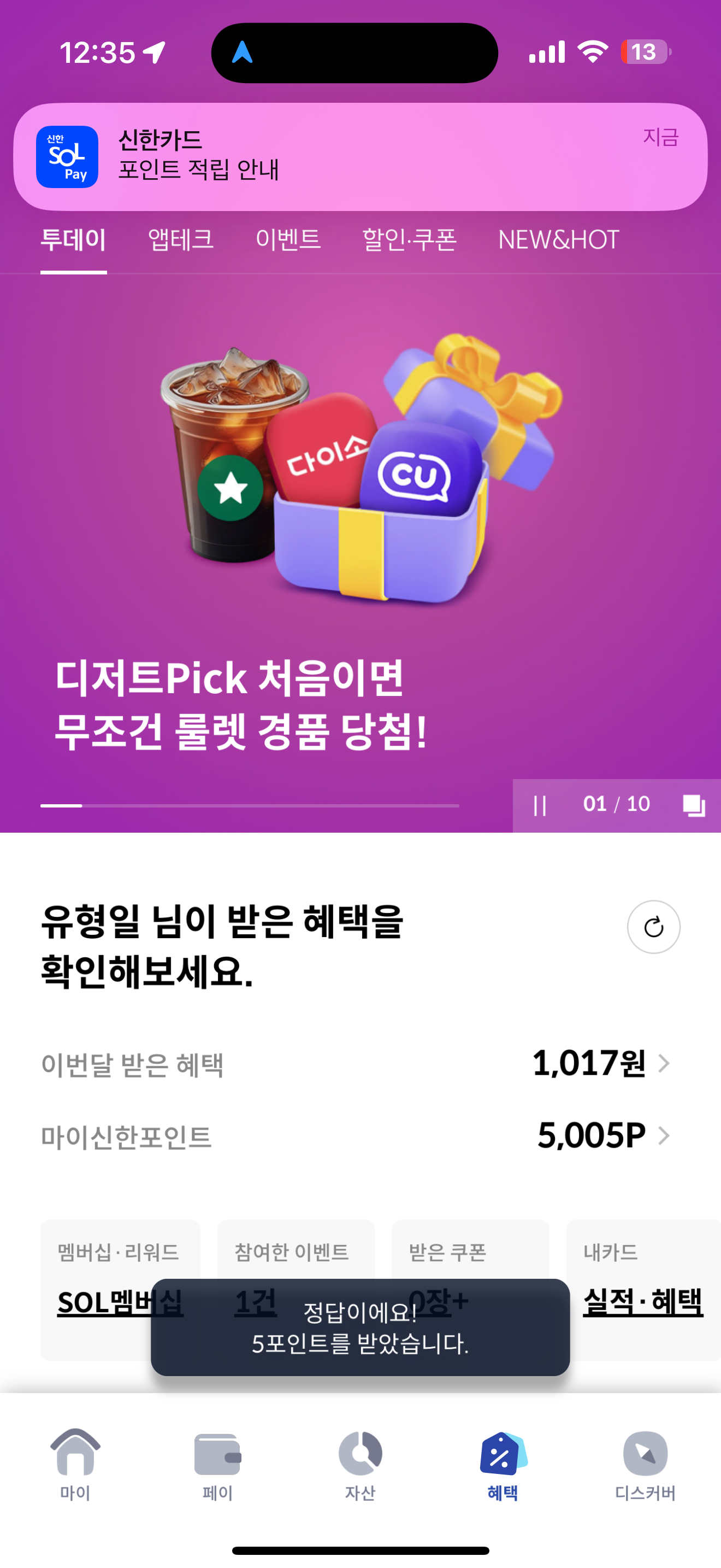 신한카드 퀴즈팡팡 정답은 190 입니다