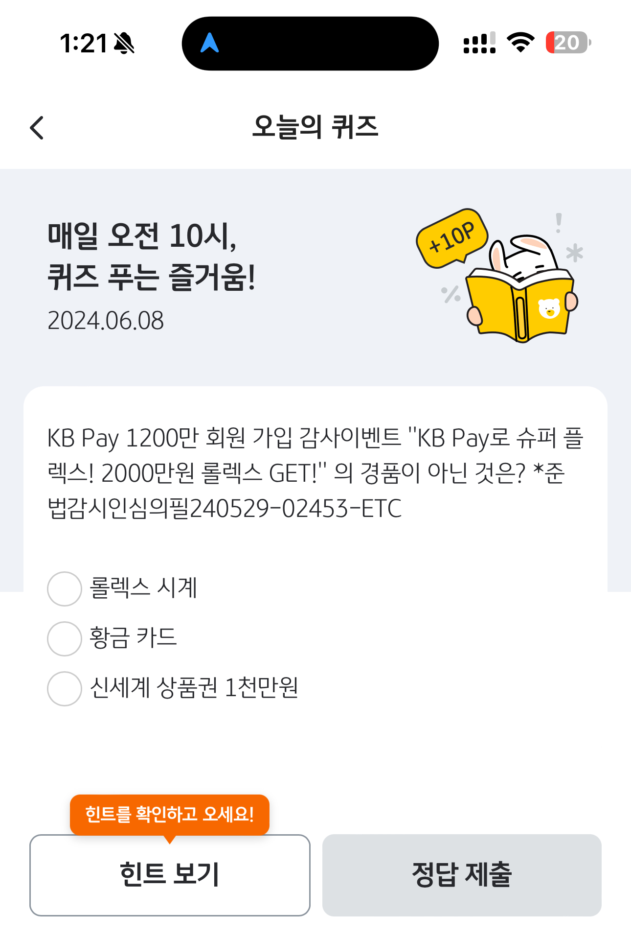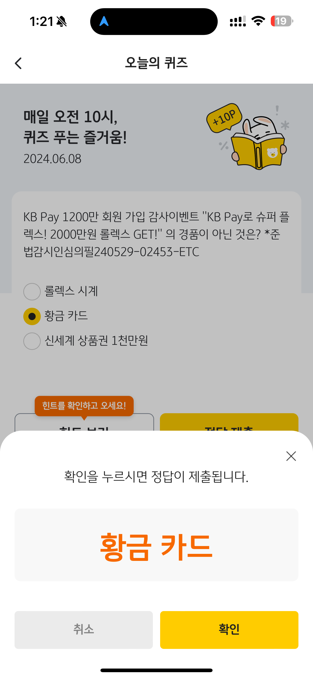 KB Pay 오늘의 퀴즈 정답은 황금 카드 입니다