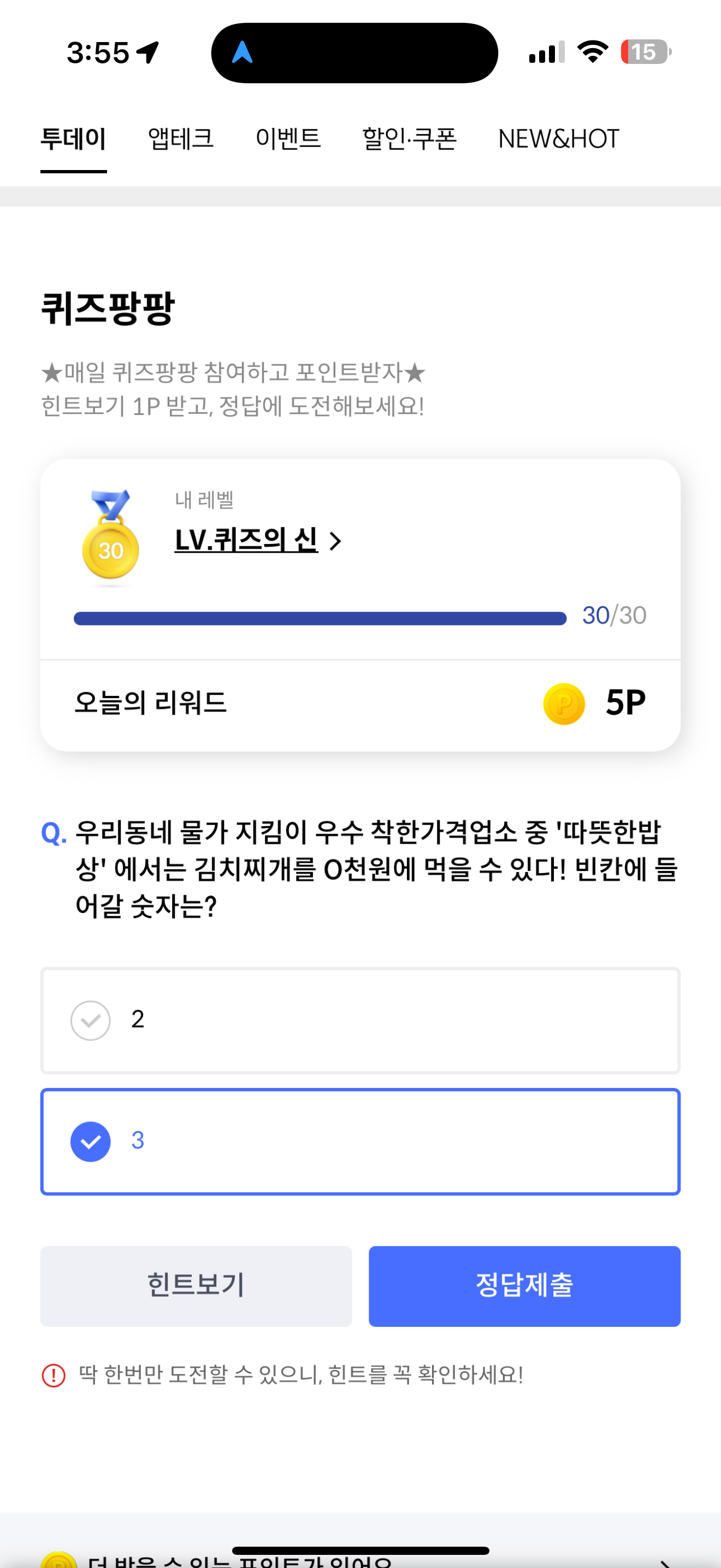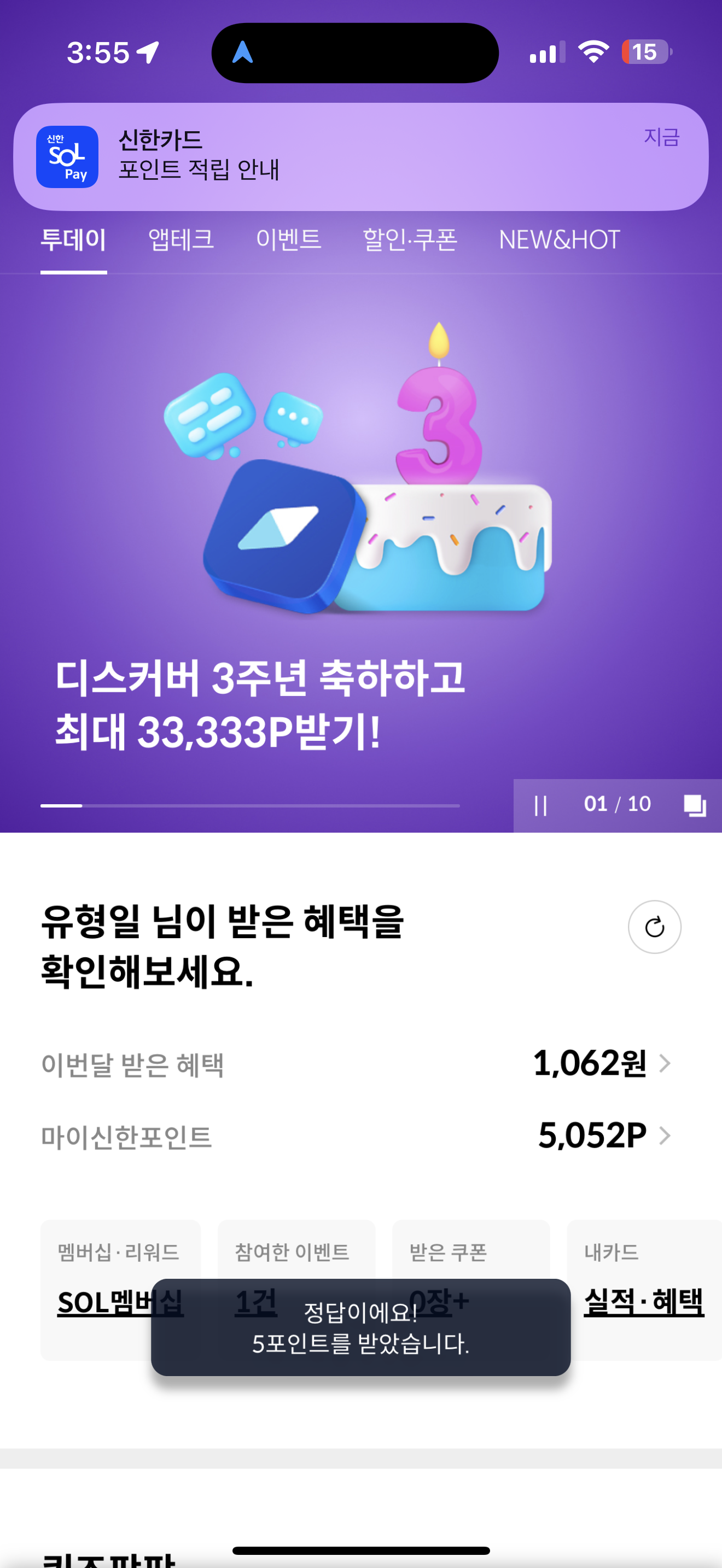 신한카드 퀴즈팡팡 정답은 3 입니다