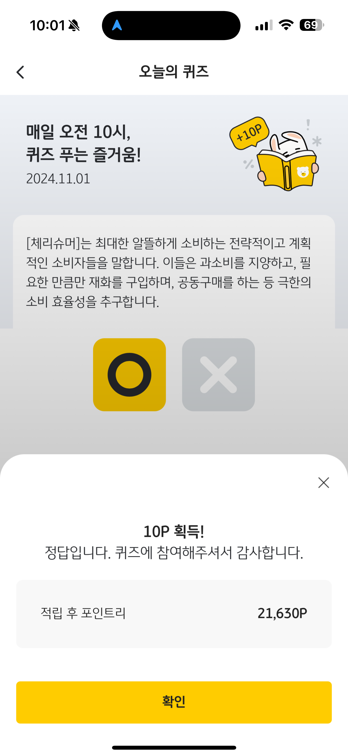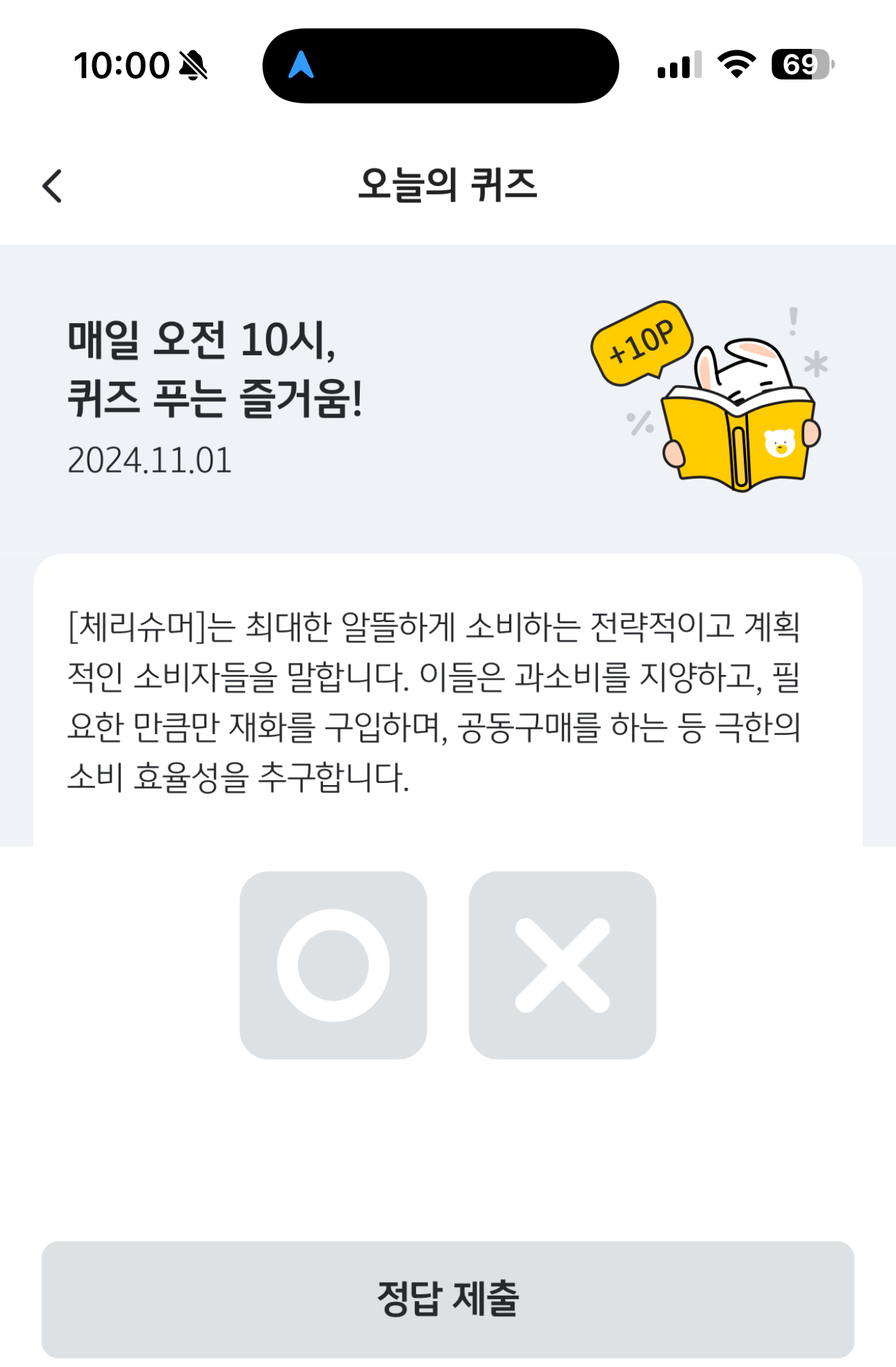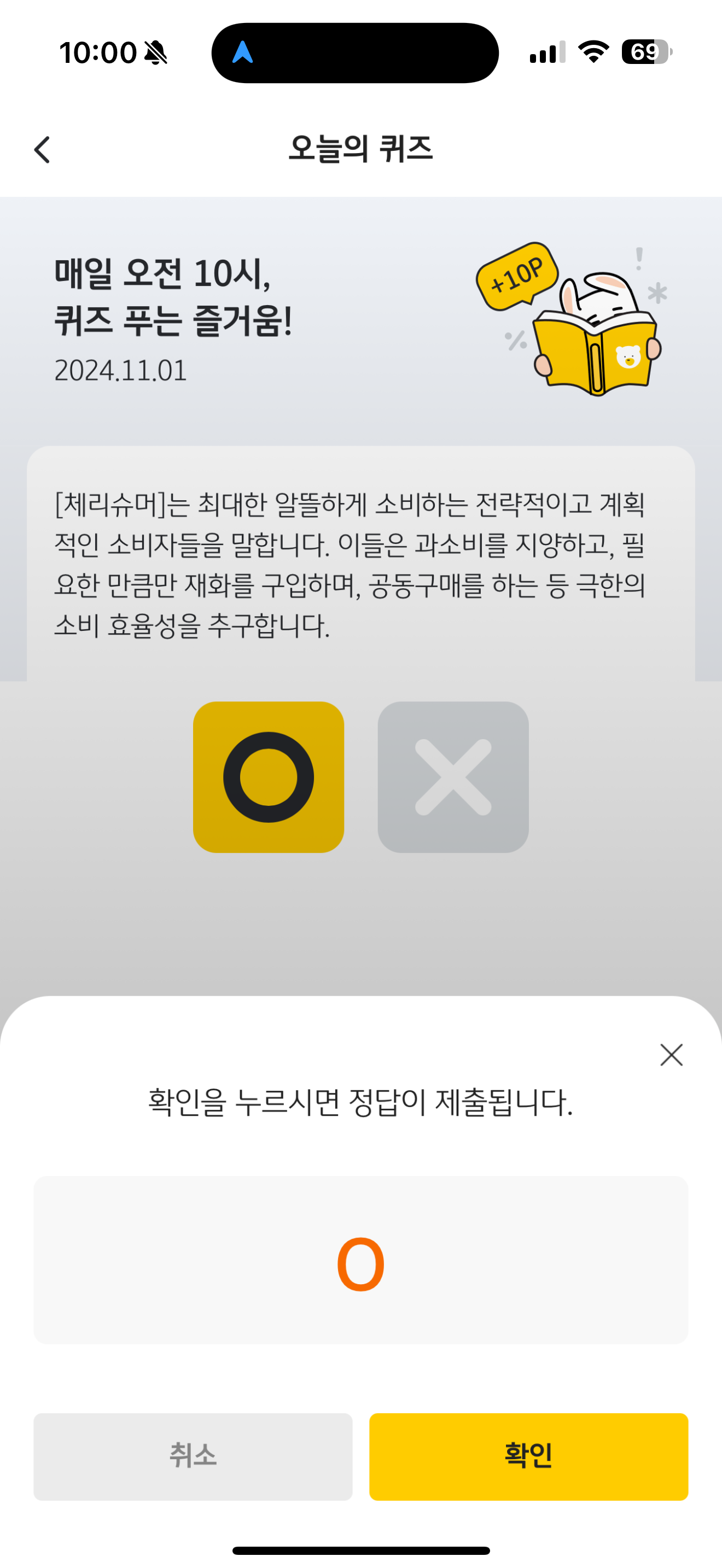 [체리슈머]는 최대한 알뜰하게 소비하는 전략적이고 계획적인 소비자들을 말합니다. 이들은 과소비를 지양하고, 필요한 만큼만 재화를 구입하며, 공동구매를 하는 등 극한의 소비 효율성을 추구합니다. O, X 퀴즈인데요. 요즘은 요노족도 뜨고 있죠. 비슷한 소비현상이라고 보시면 됩니다.