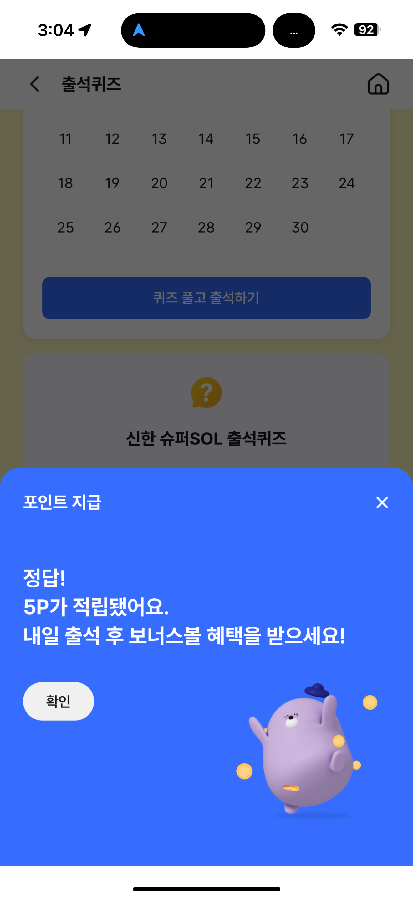 신한 슈퍼SOL 출석퀴즈 정답은 50P 입니다