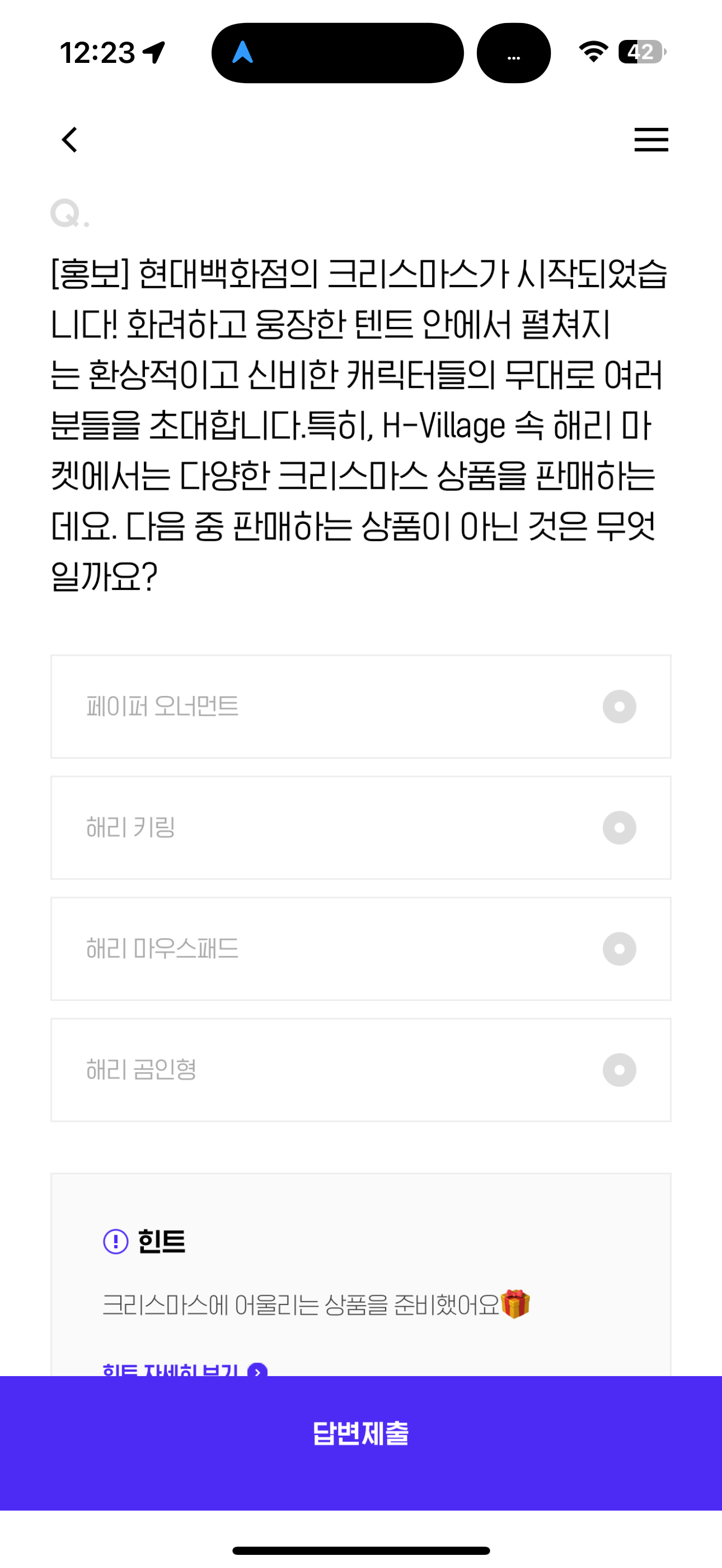 현대백화점의 크리스마스가 시작되었습니다! 화려하고 웅장한 테트 안에서 펼쳐지는 환상적이고 신비한 캐릭터들의 무대로 여러분들을 초대합니다.특히, H-Village 속 해리 마켓에서는 다양한 크리스마스 상품을 판매하는데요. 다음 중 판매하는 상품이 아닌 것은 무엇일까요? 보기는 1. 페이퍼 오너먼트 2. 해리 키링 3. 해리 마우스패드 4. 해리 곰인형 입니다
