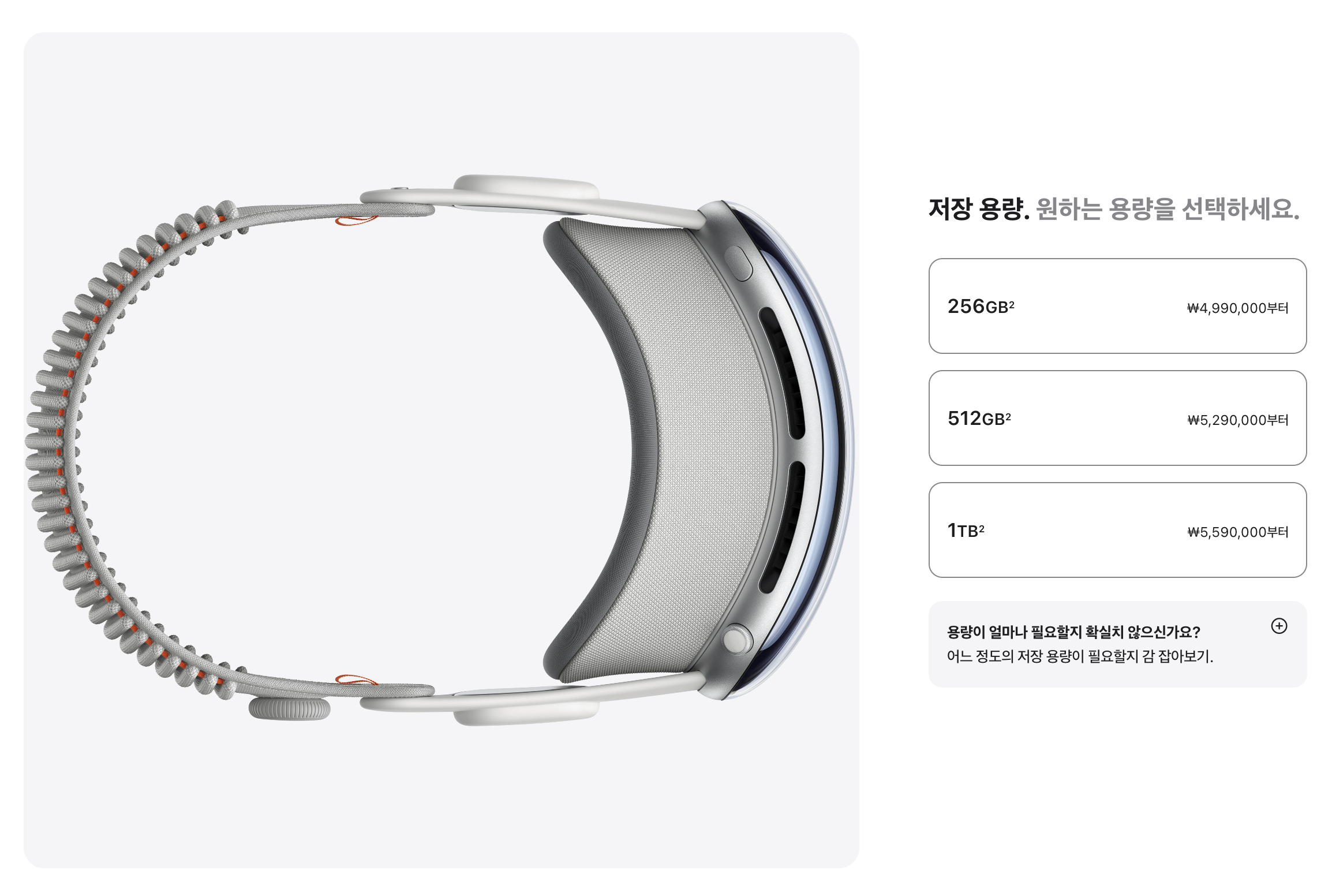 애플 비전 프로(Apple Vision Pro) 가격은 용량에 따라 3종류의 가격 옵션이 있습니다. 256GB 모델은 4,990,000원, 512GB 5,290,000원, 1TB 5,590,000원 입니다.