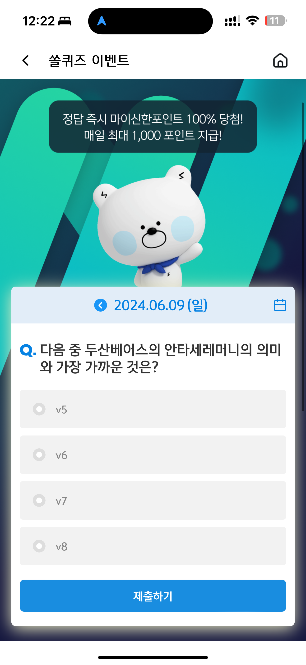 신한 슈퍼SOL 야구/상식 쏠퀴즈 정답은 v7 입니다