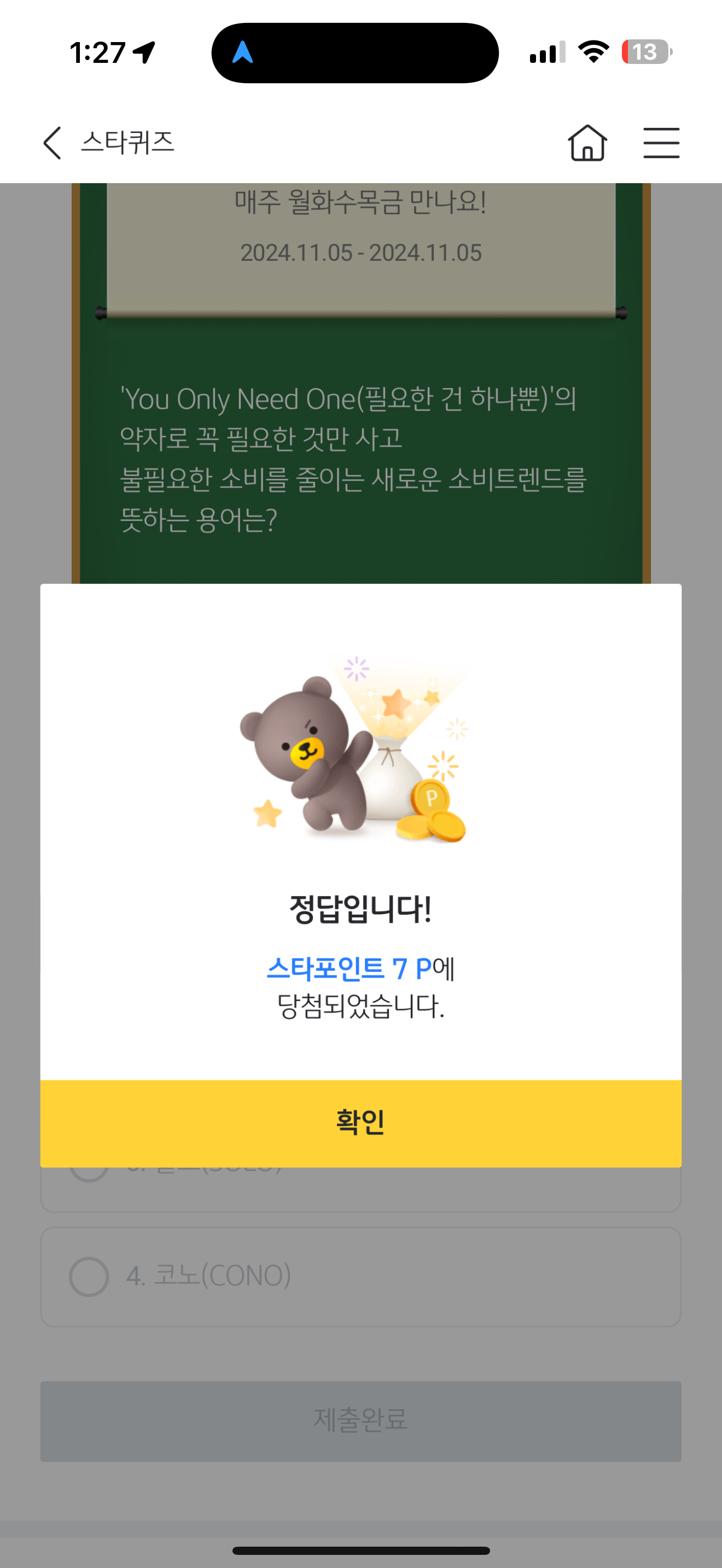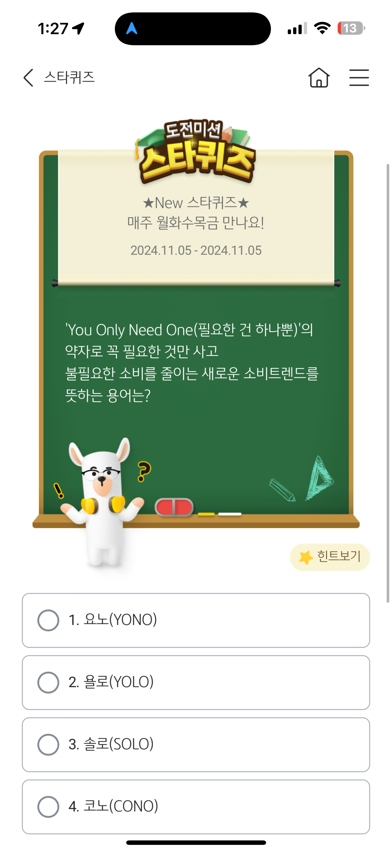 KB스타뱅킹 스타퀴즈 11월 5일 정답('You Only Need One(필요한 건 하나뿐)'의 약자로 꼭 필요한 것만 사고 불필요한 소비를 줄이는 새로운 소비트렌드를 뜻하는 용어는?)