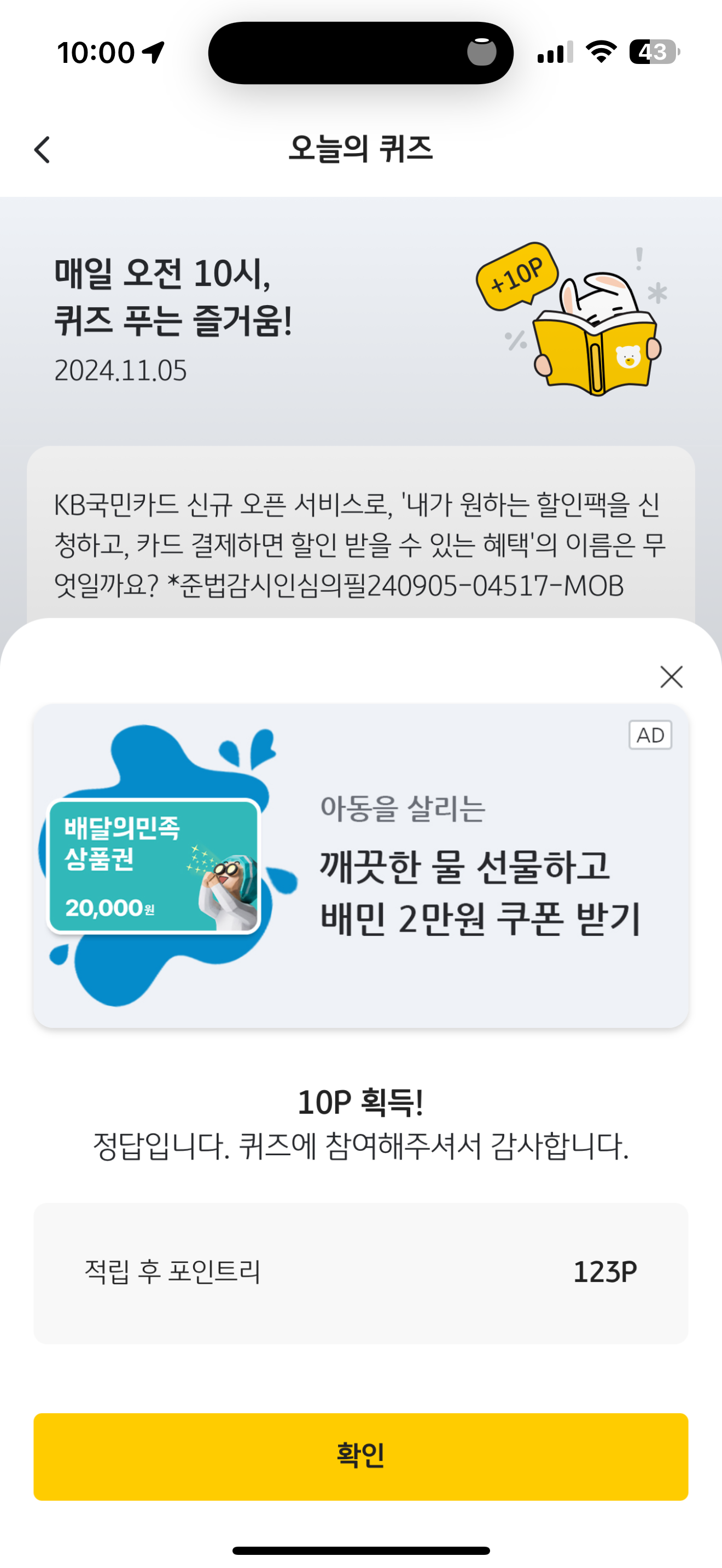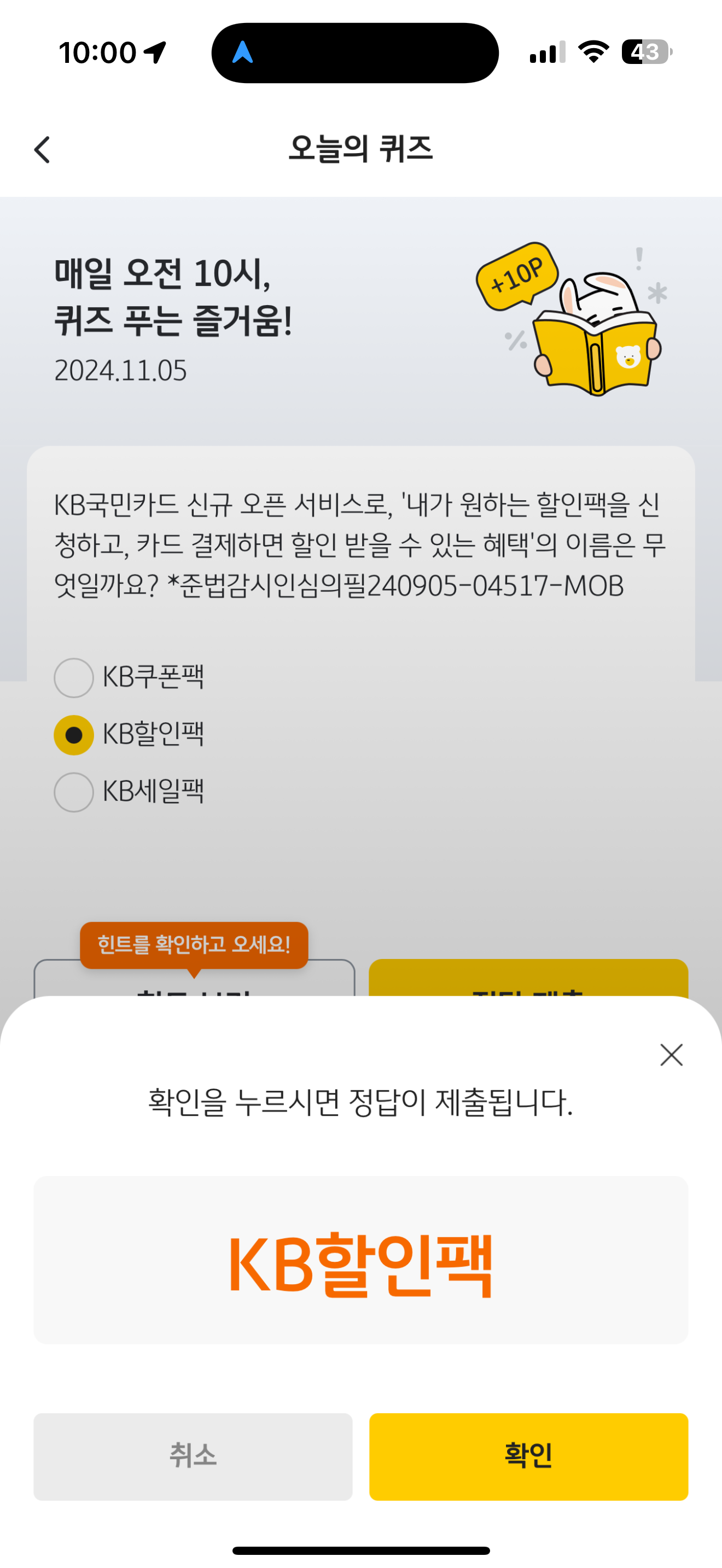 KB Pay 오늘의 퀴즈 정답은 KB할인팩 입니다