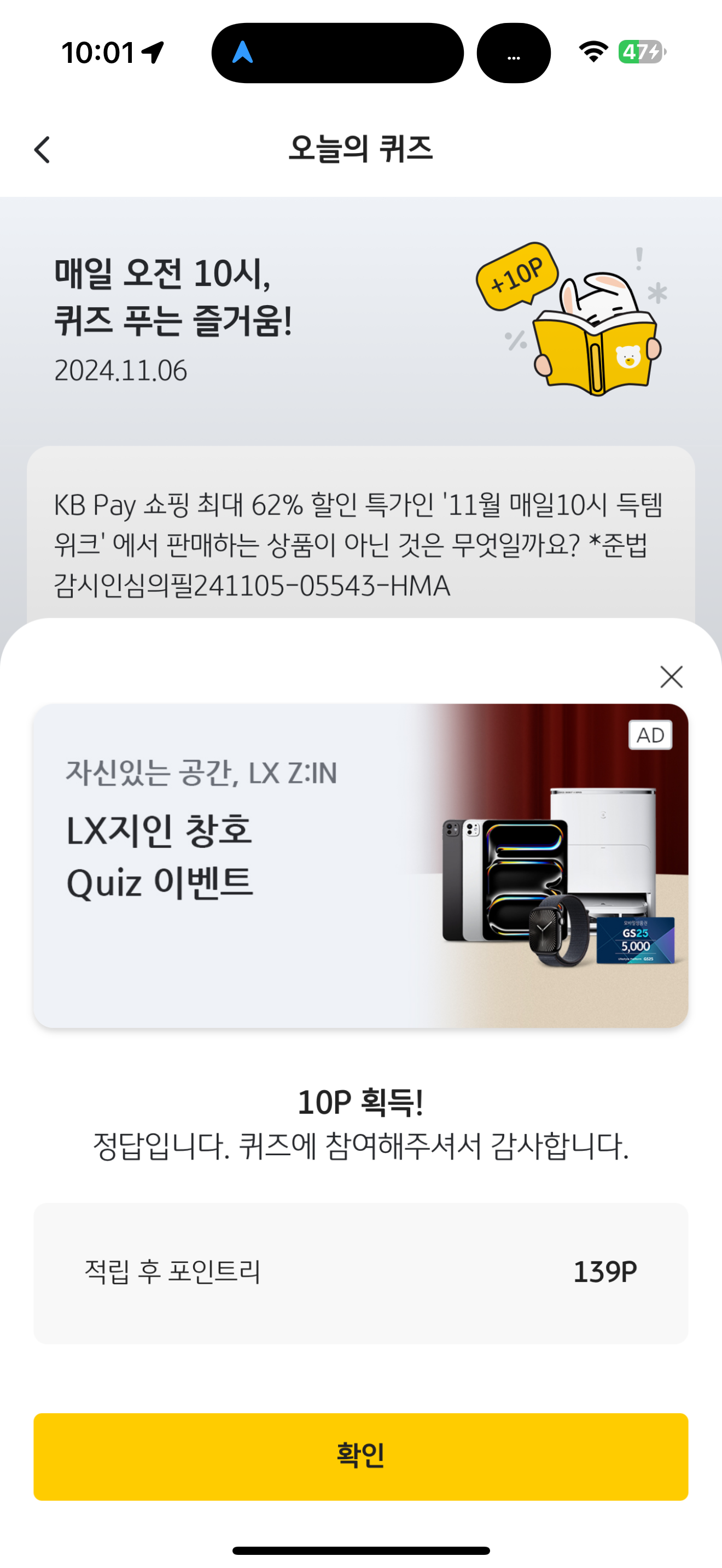 KB Pay 오늘의 퀴즈 11월 6일 문제입니다