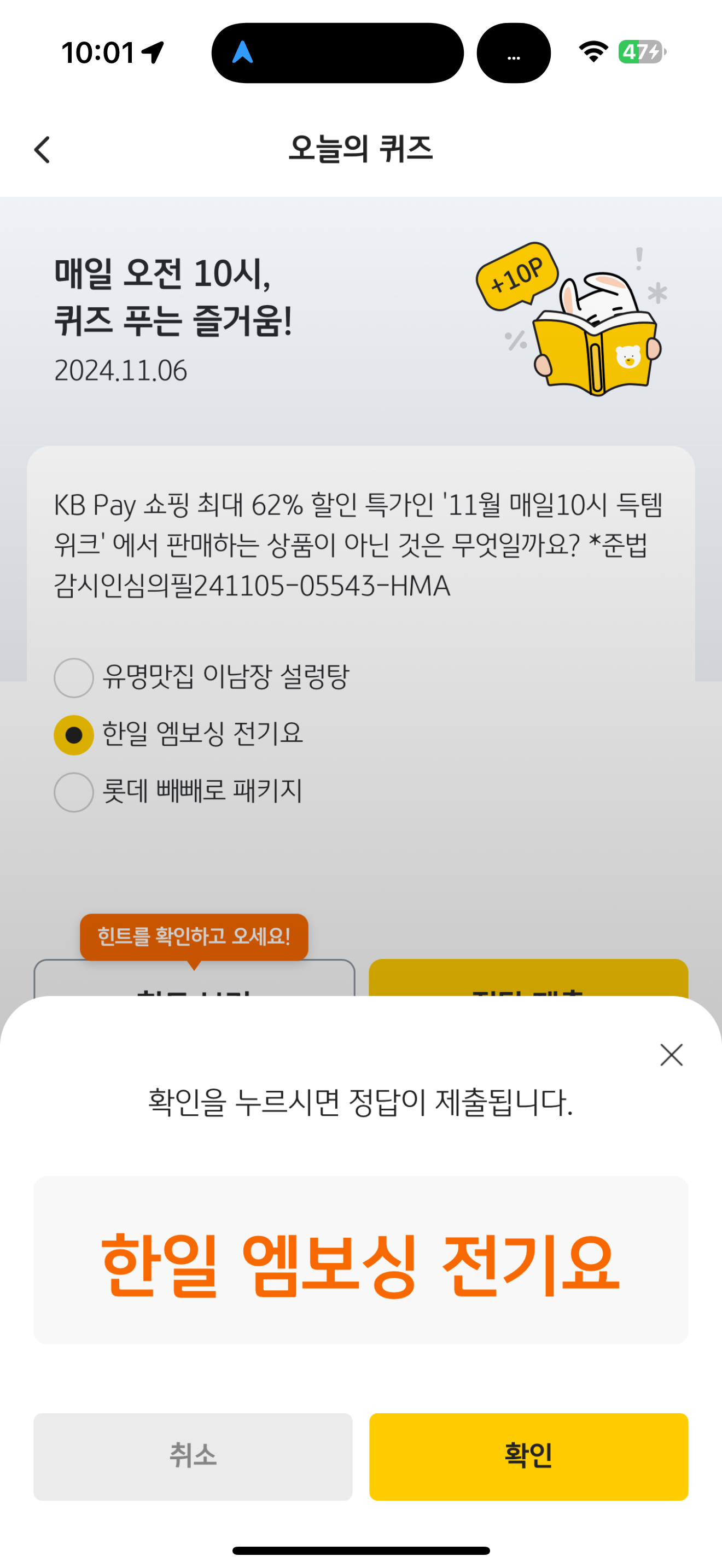 KB Pay 오늘의 퀴즈 11월 6일 정답(KB Pay 쇼핑 최대 62% 할인 특가인 '11월 매일10시 득템위크' 에서 판매하는 상품이 아닌 것은 무엇일까요? )