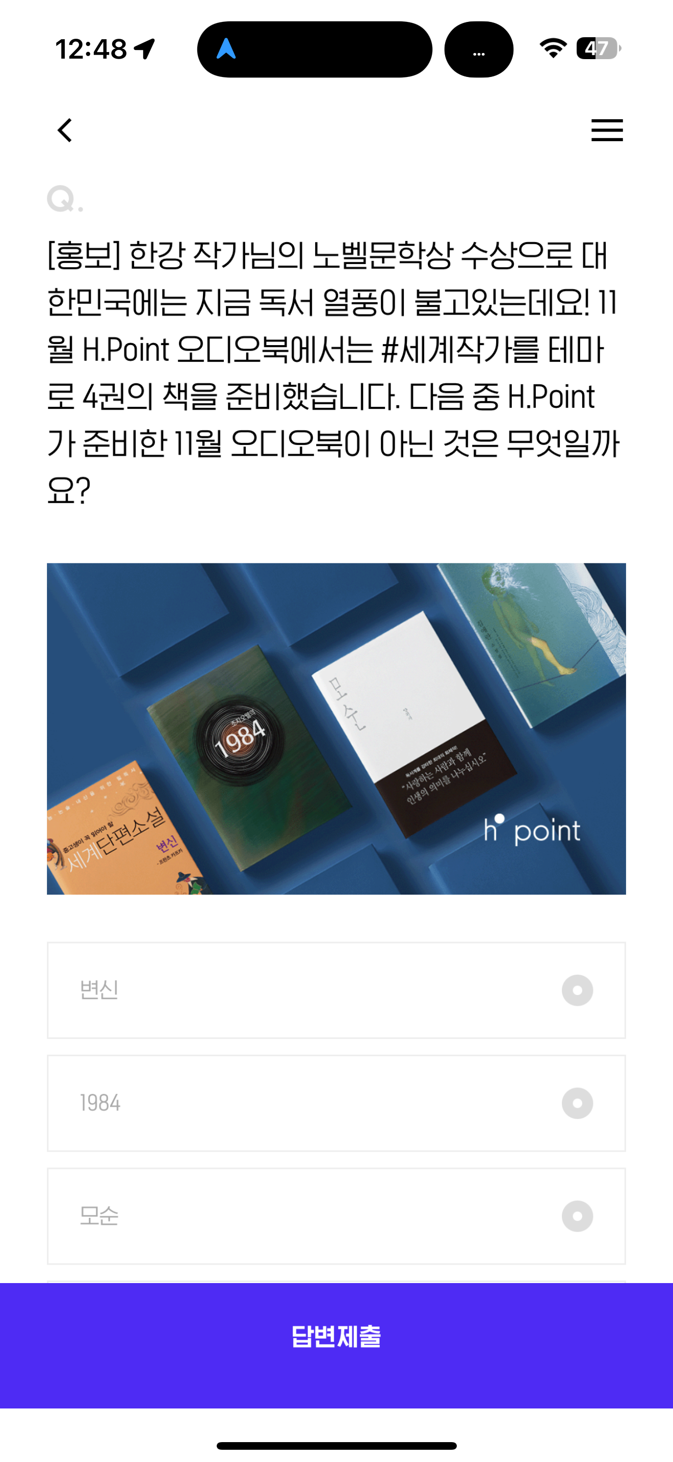 한강 작가님의 노벨문학상 수상으로 대한민국에는 지금 독서 열풍이 불고있는데요! 11월 H.Point 오디오북에서는 #세계작가를 테마로 4권의 책을 준비했습니다. 다음 중 H.Point가 준비한 11월 오디오북이 아닌 것은 무엇일까요? 보기는 1. 변신 2. 1984 3. 모순 4. 소년이 온다 입니다.