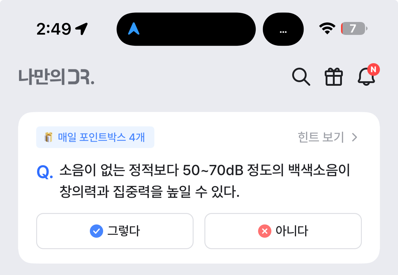 나만의 닥터 퀴즈 11월 7일 정답(소음이 없는 정적보다 50~70dB 정도의 백색소음이 창의력과 집중력을 높일 수 있다)