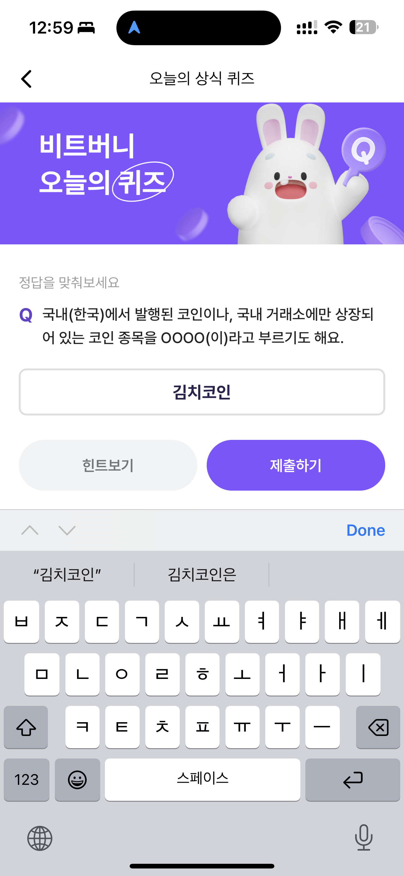 비트버니 오늘의 퀴즈 정답은 김치코인 입니다