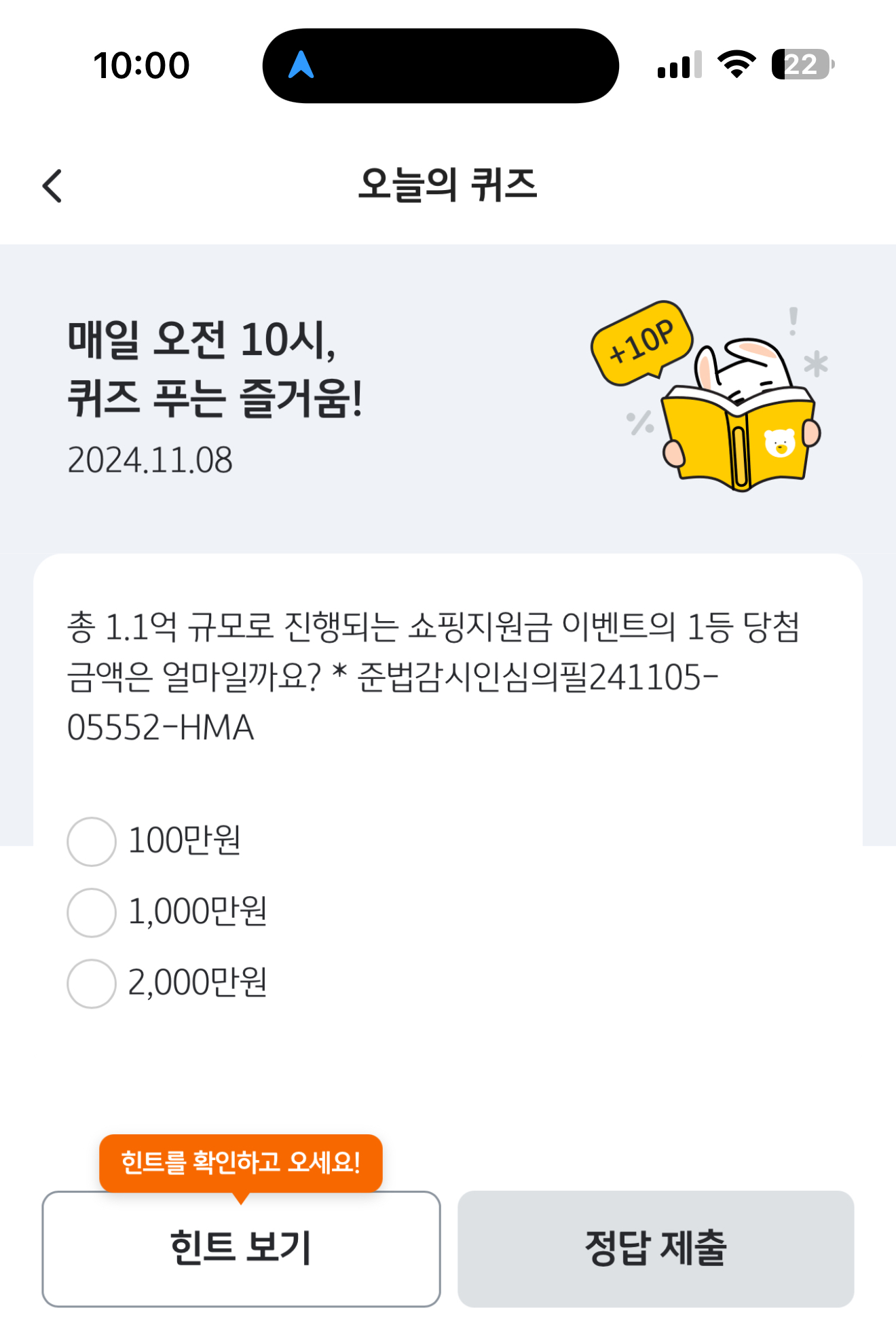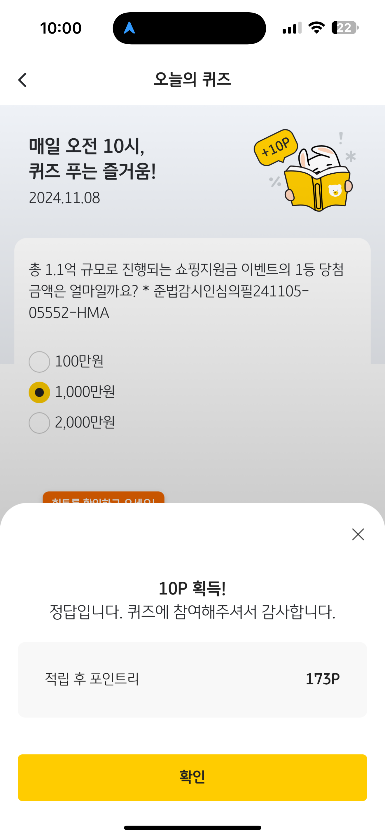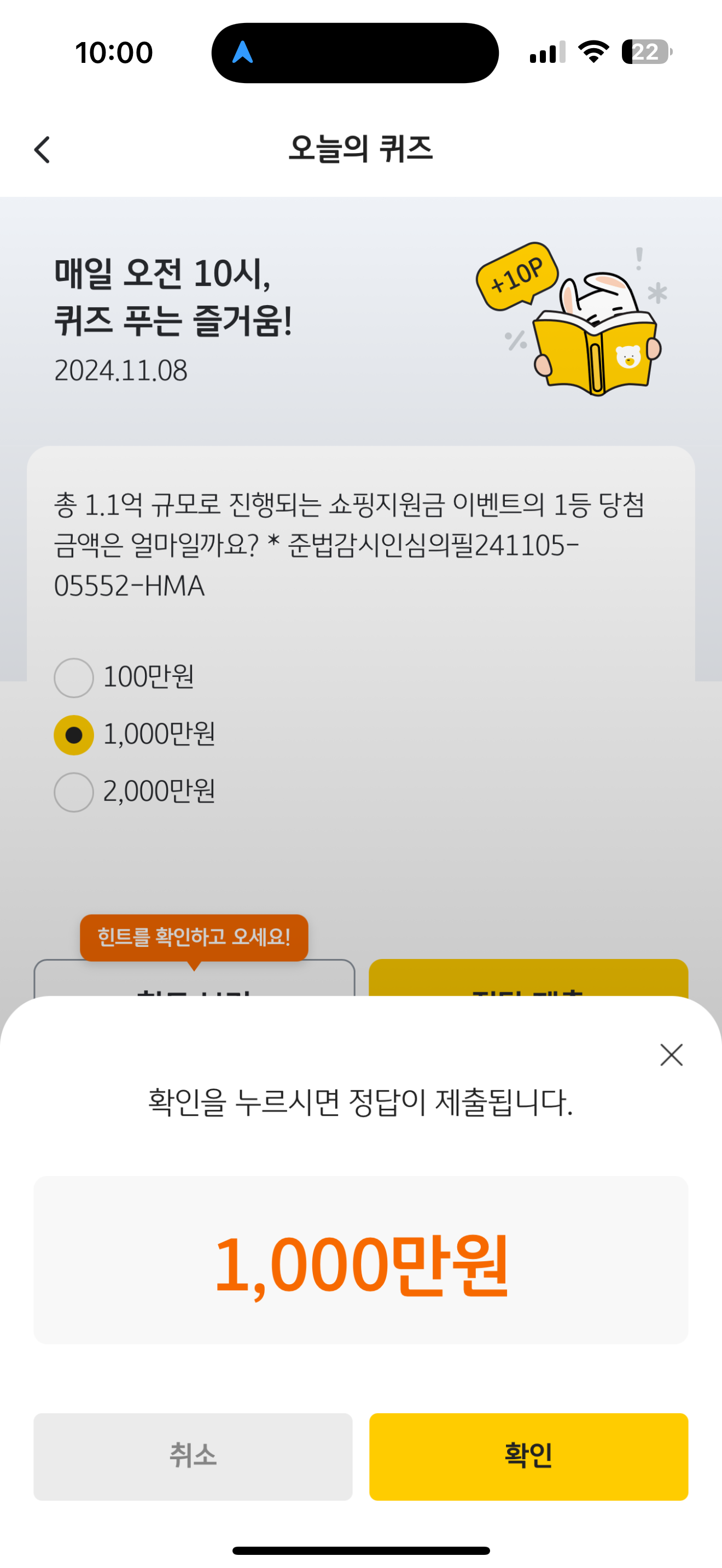 KB Pay 오늘의 퀴즈 정답은 1,000만원 입니다
