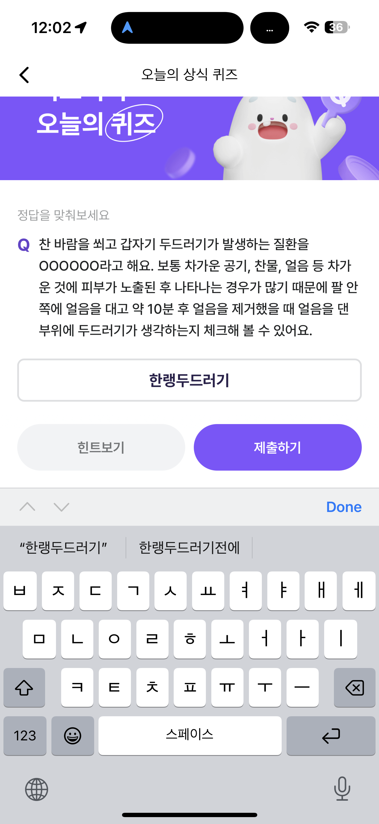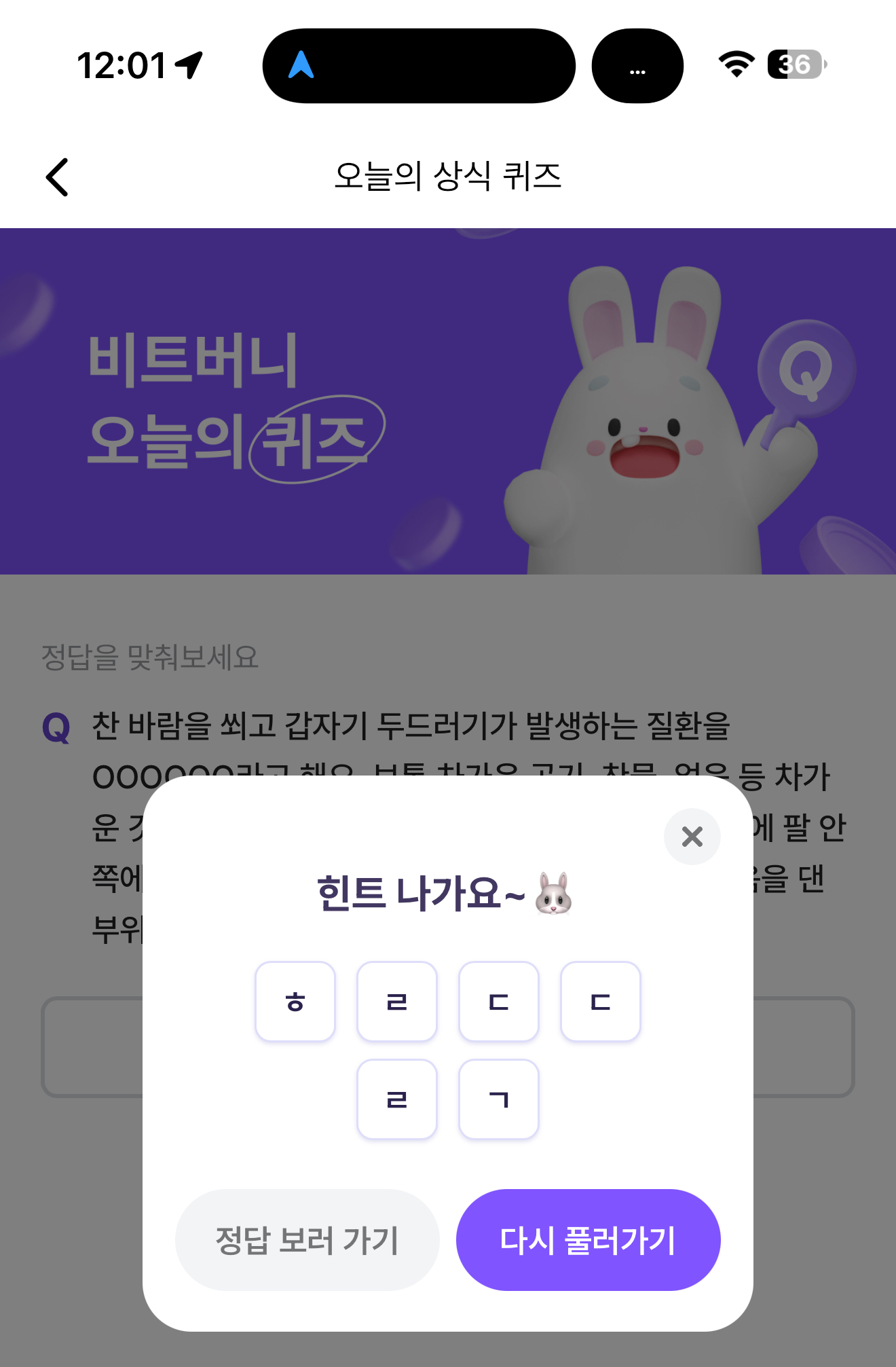 비트버니 오늘의 퀴즈 정답은 한랭두드러기 입니다.