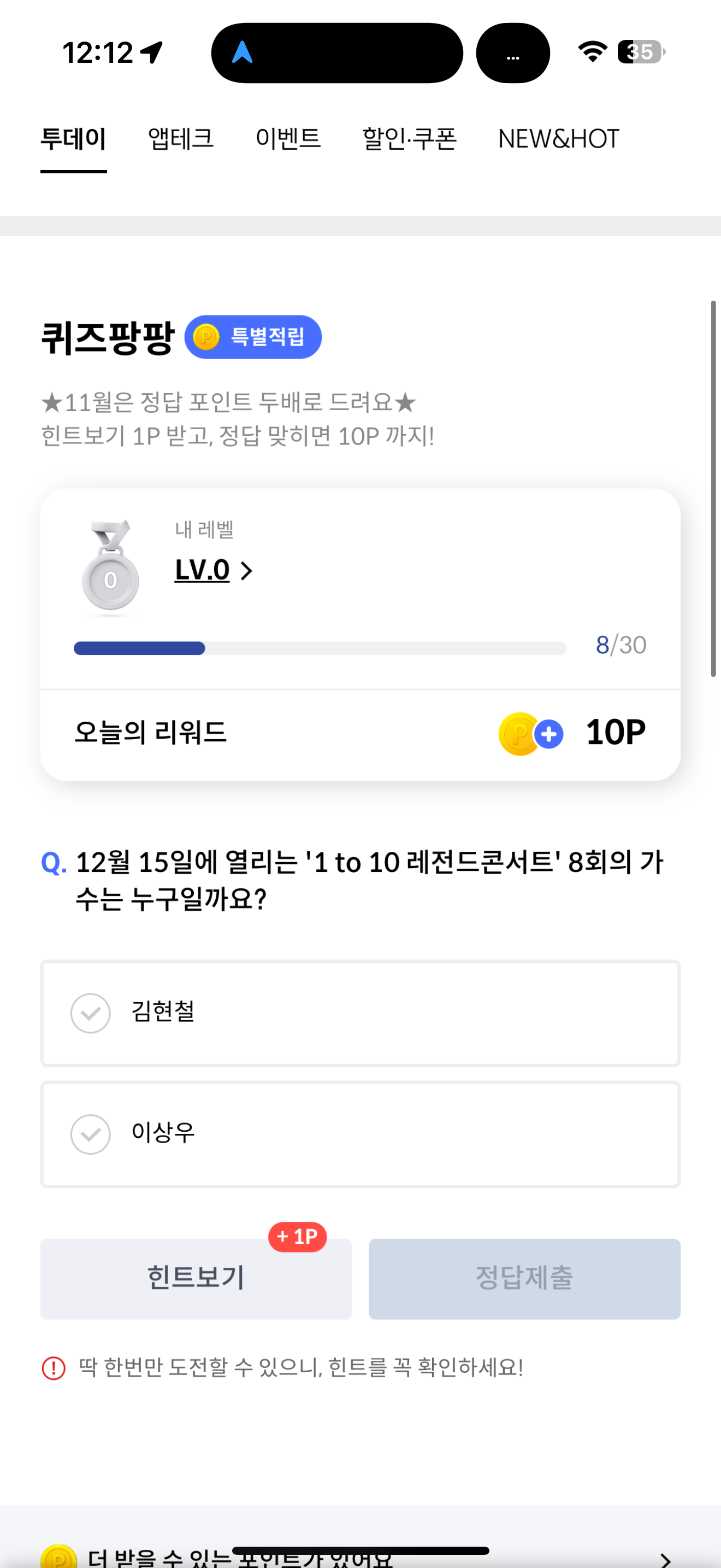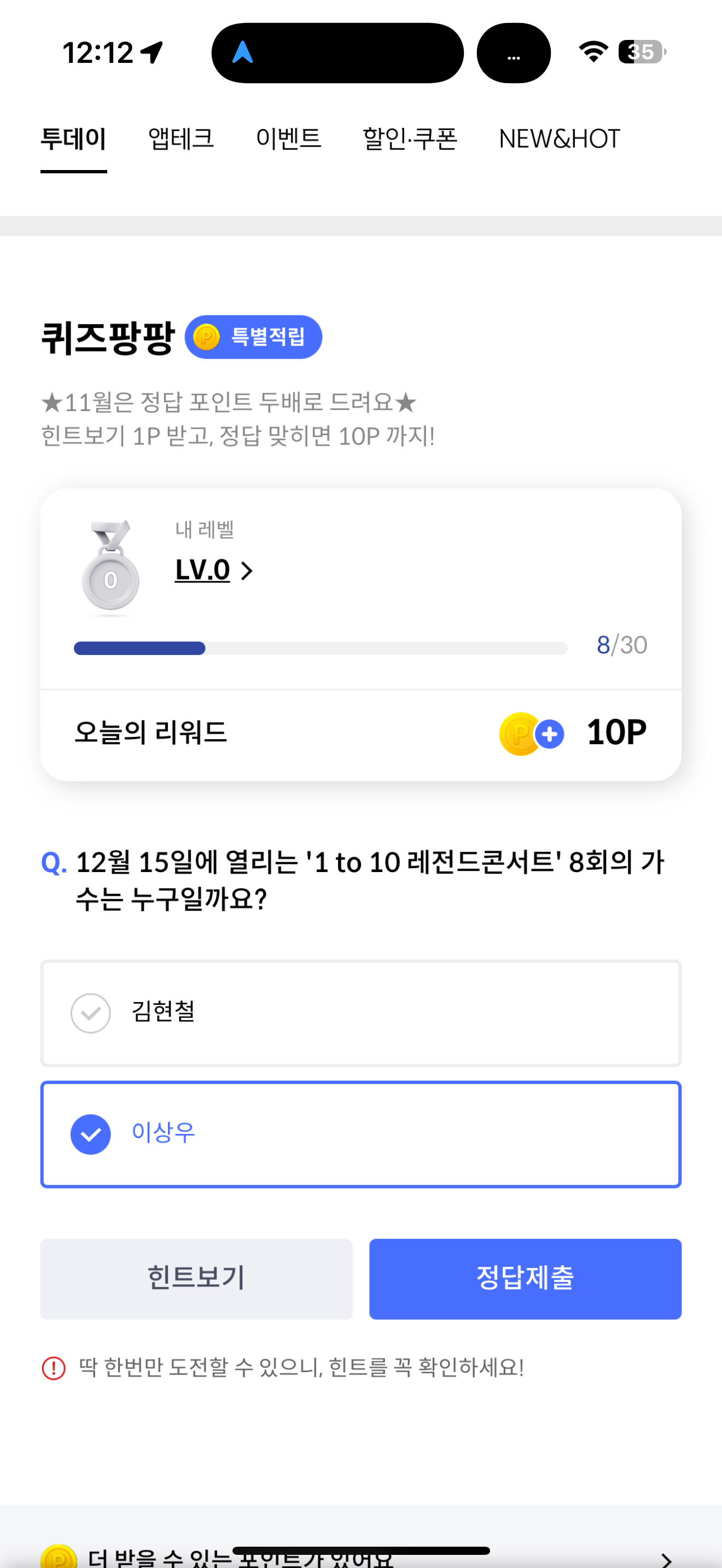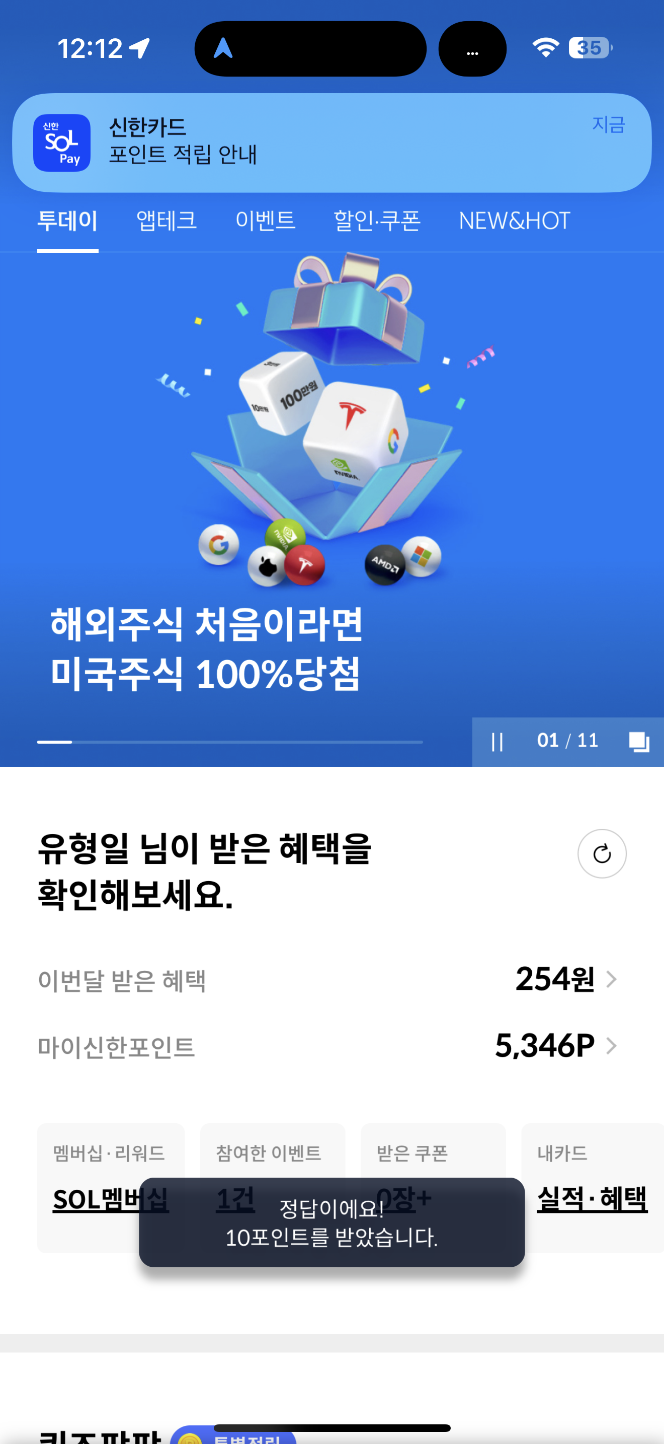 신한카드 퀴즈팡팡 정답은 이상우 입니다