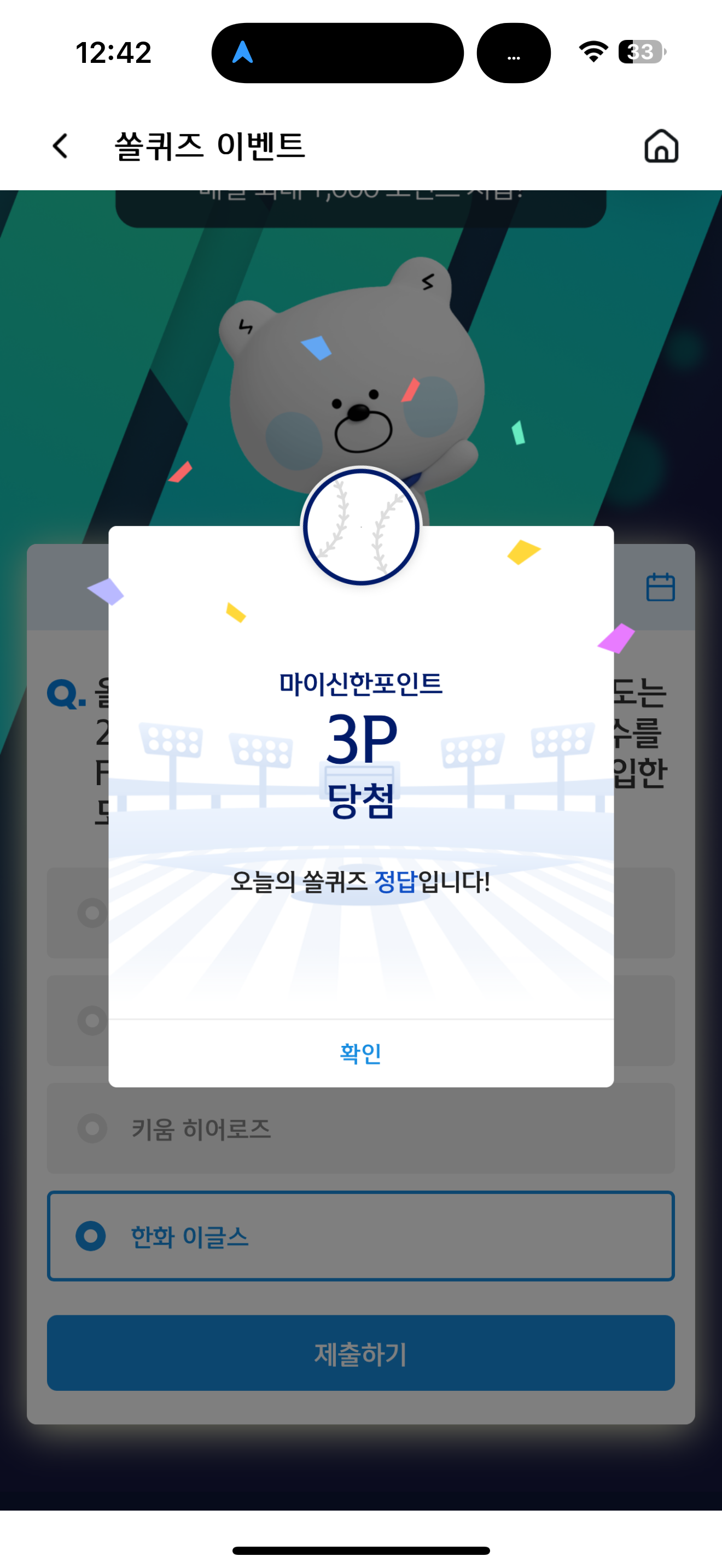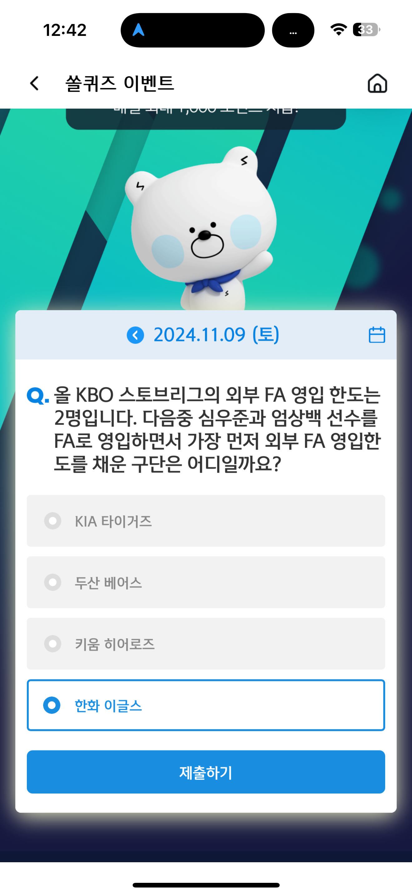 신한 슈퍼SOL 야구/상식 쏠퀴즈 정답은 한화 이글스 입니다