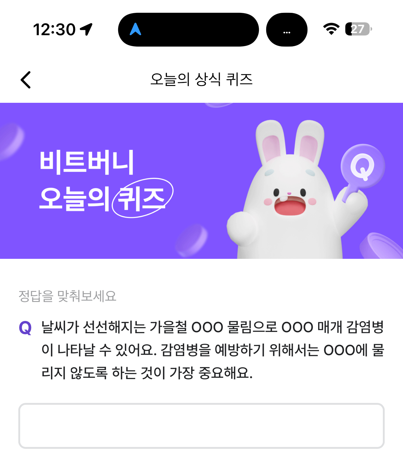 날씨가 선선해지는 가을철 OOO 물림으로 OOO 매개 감염병이 나타날 수 있어요. 감염병을 예방하기 위해서는 OOO에 물리지 않도록 하는 것이 가장 중요해요. 주관식 퀴즈인데요. 잔디 밭에 눕지 말라는 이야기가 있죠. 꼭 알아두세요