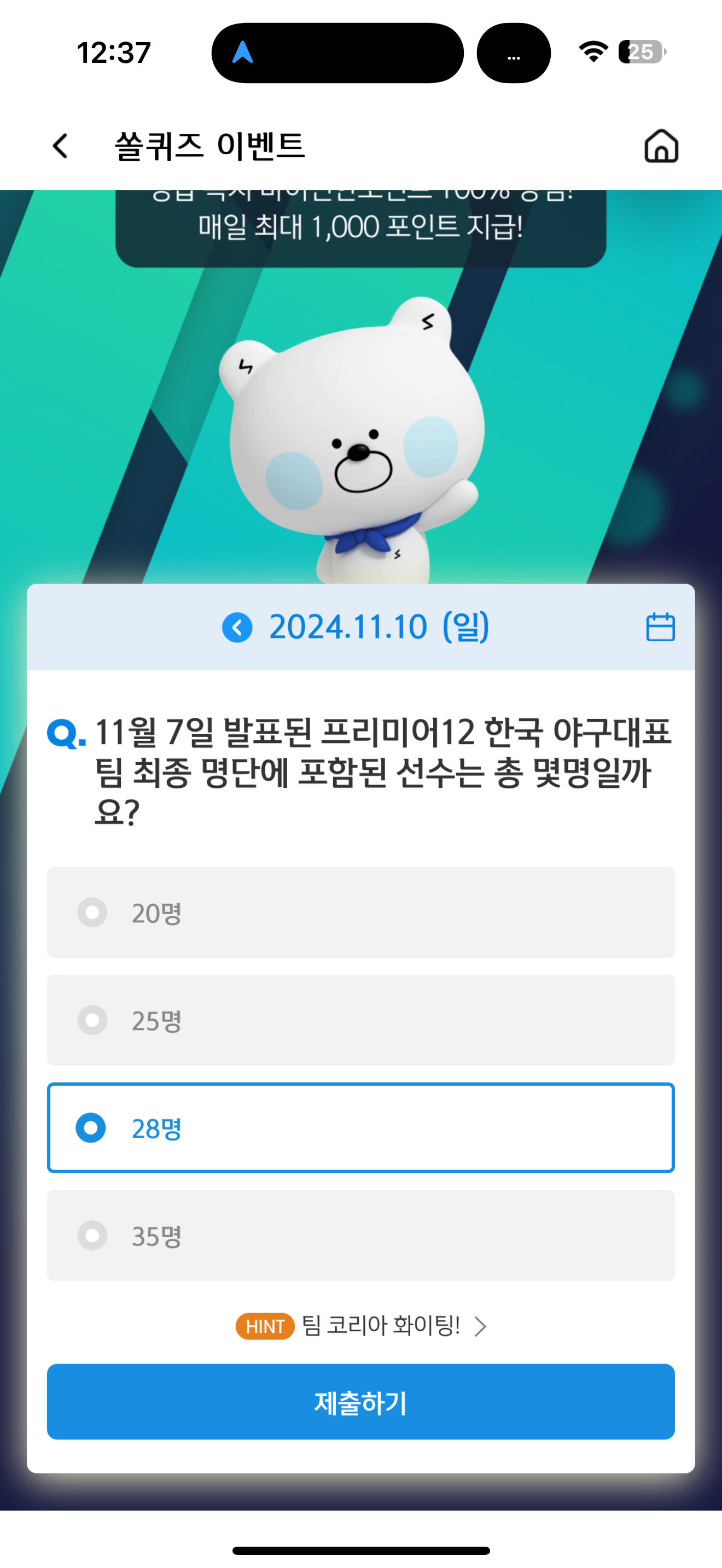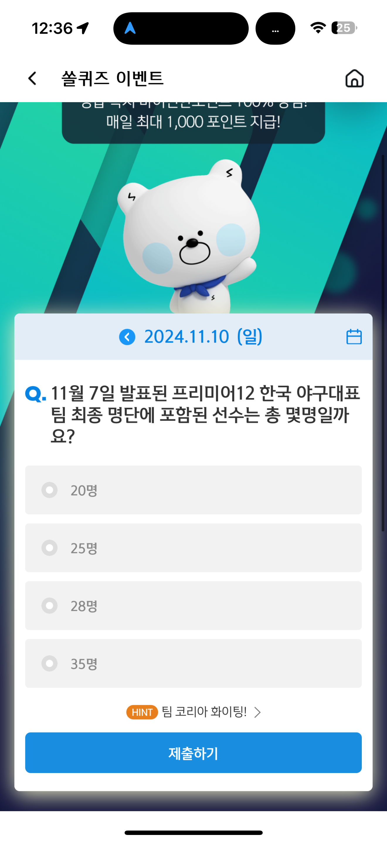 신한 슈퍼SOL 야구/상식 쏠퀴즈 정답은 28명 입니다