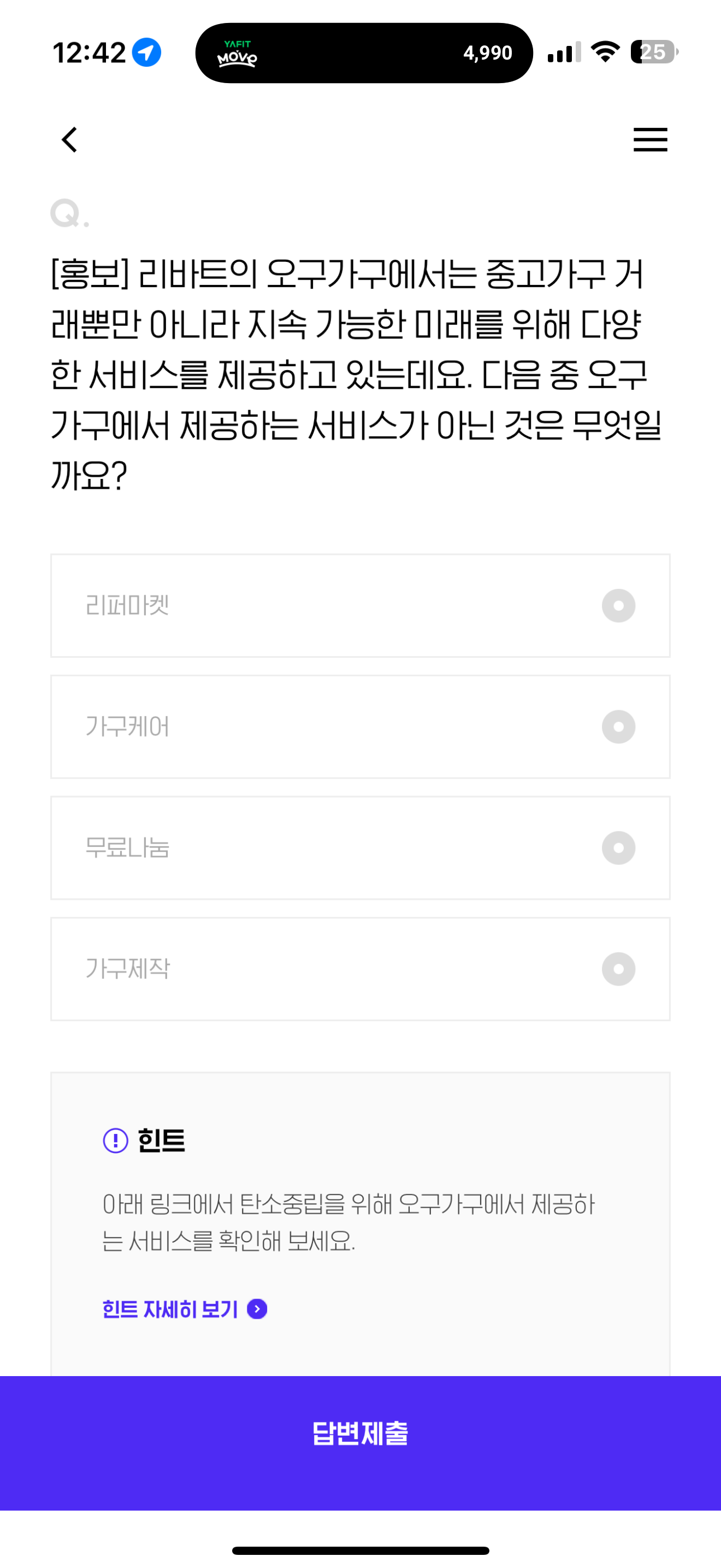 H포인트 퀴즈 11월 10일 정답(리바트의 오구가구에서는 중고가구 거래뿐만 아니라 지속 가능한 미래를 위해 다양한 서비스를 제공하고 있는데요. 다음 중 오구 가구에서 제공하는 서비스가 아닌 것은 무엇일까요? )
