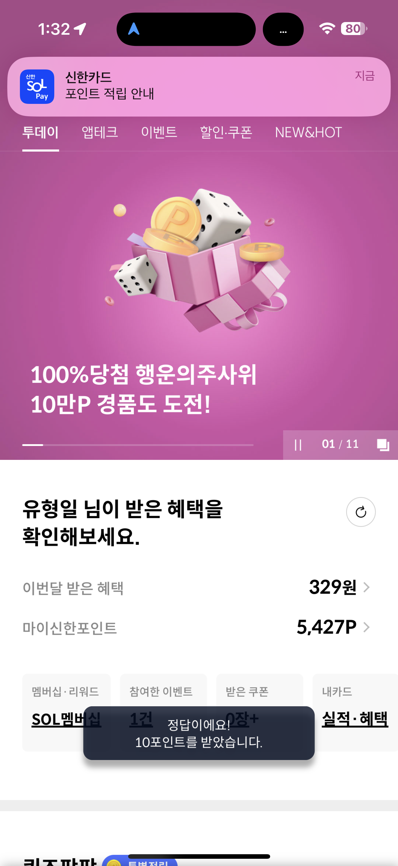 신한카드 퀴즈팡팡 11월 10일 문제입니다