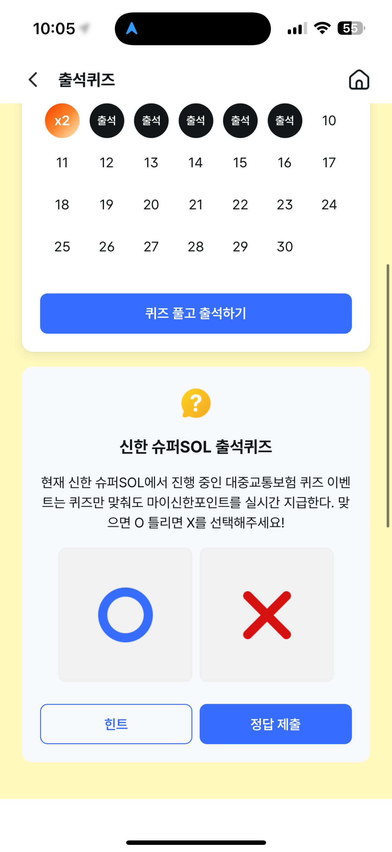 신한 슈퍼SOL 출석퀴즈 정답은 O 입니다