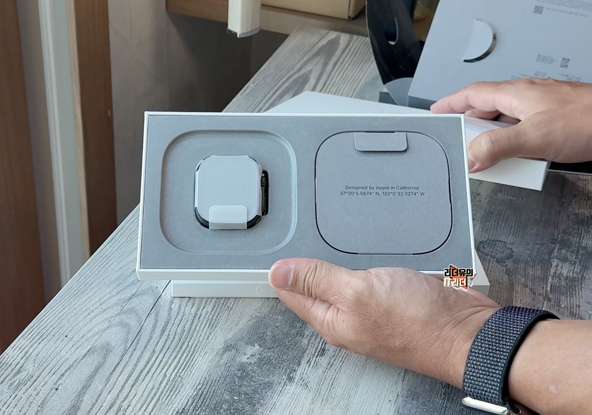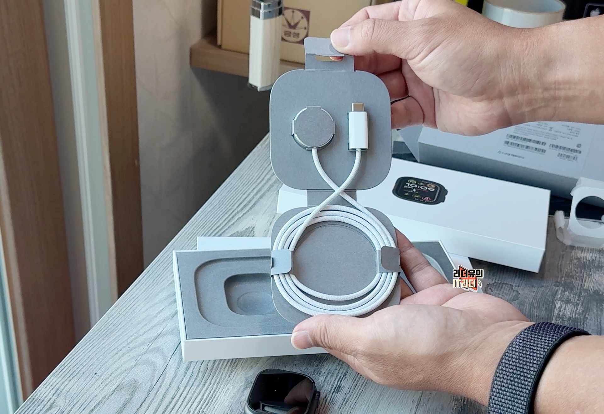 종이에 감싸진 애플워치 울트라2 본체와 그 옆에는 구성품으로 무선 충전 케이블이 들어 있습니다.