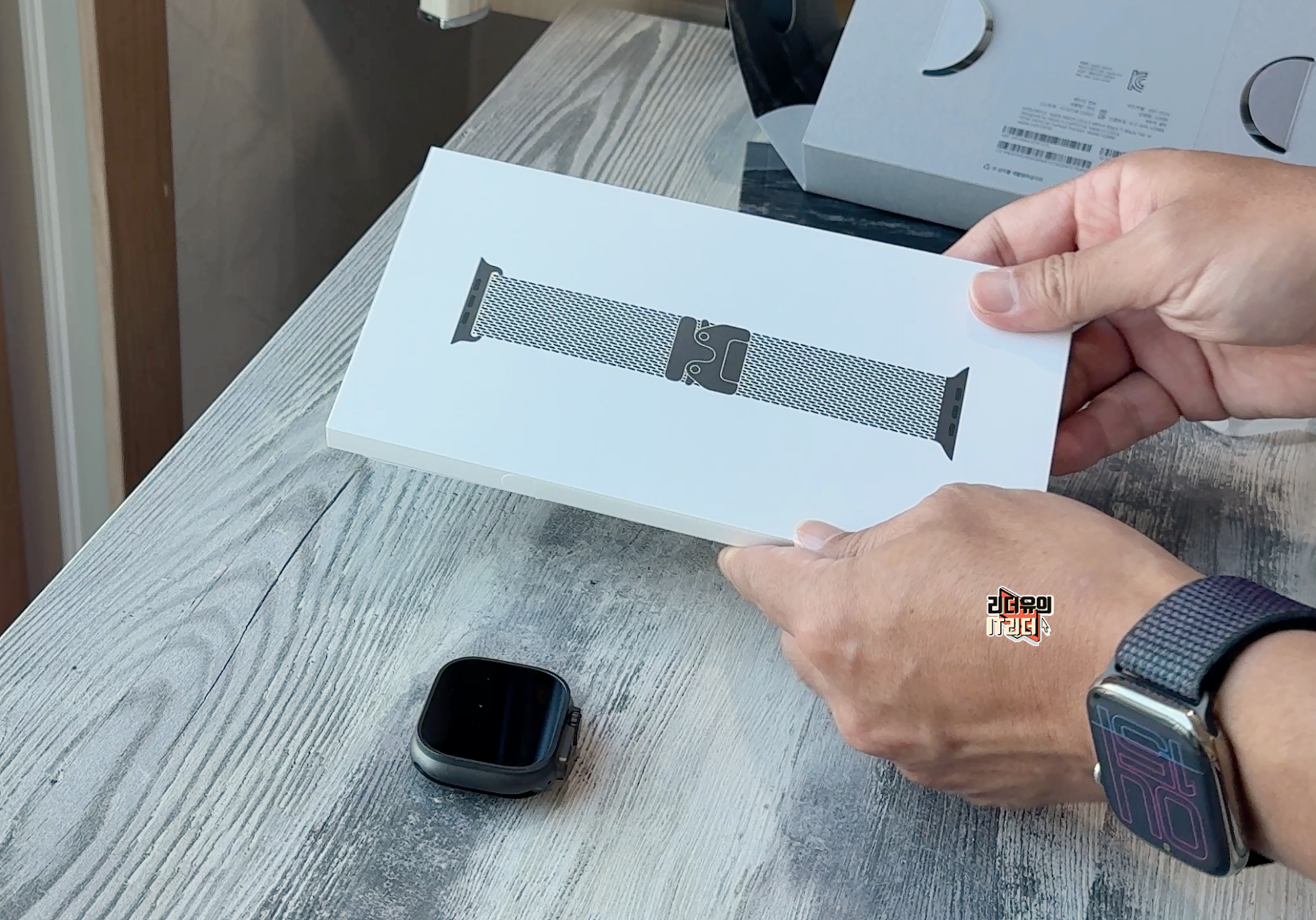 애플워치 울트라2 블랙 본체와 블랙 티타늄 밀레니즈 루프 밴드는 별도의 패키지로 들어 있습니다. 패키지는 화이트 색상이고 이미지로 해당 모델들을 확인할 수 있습니다.