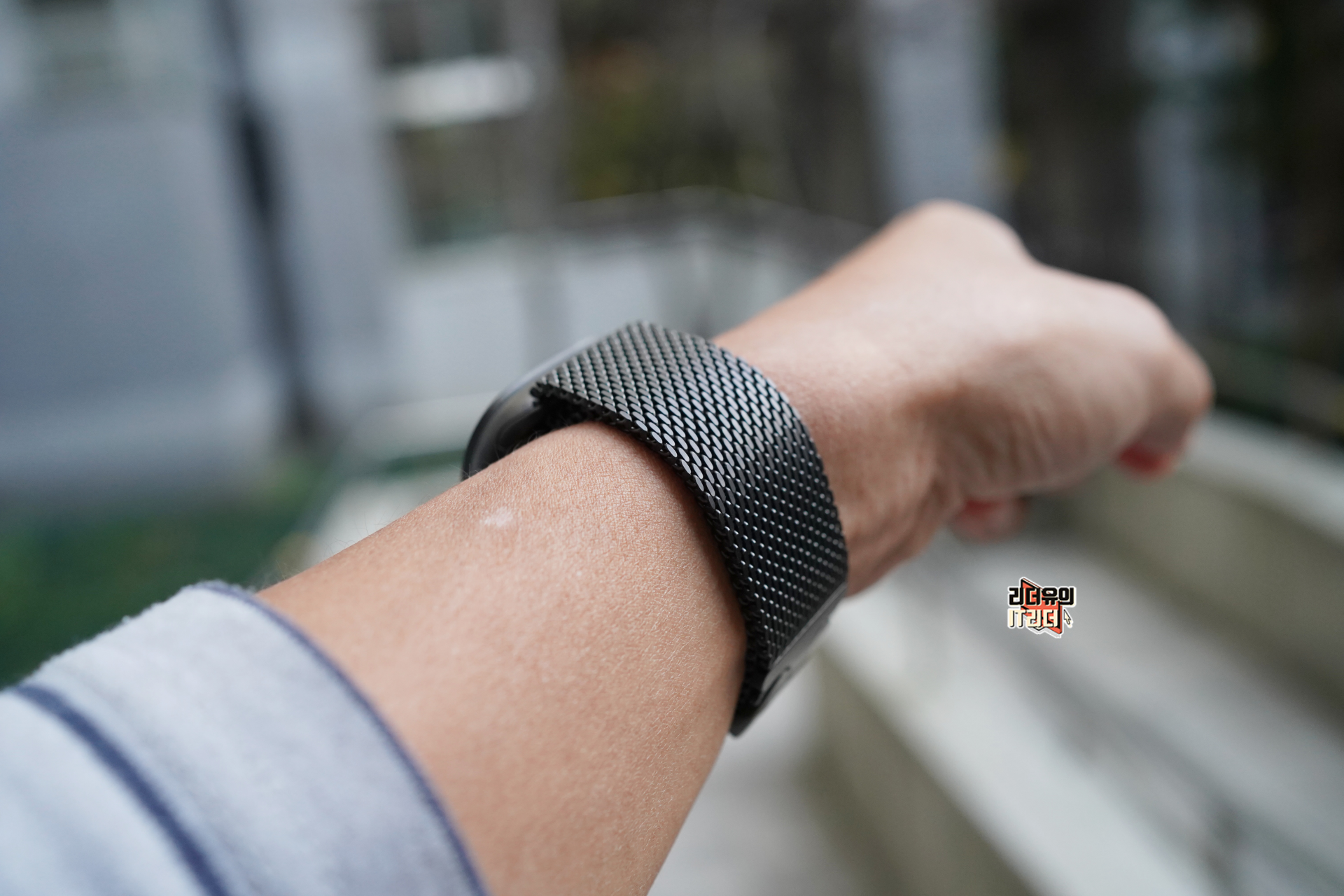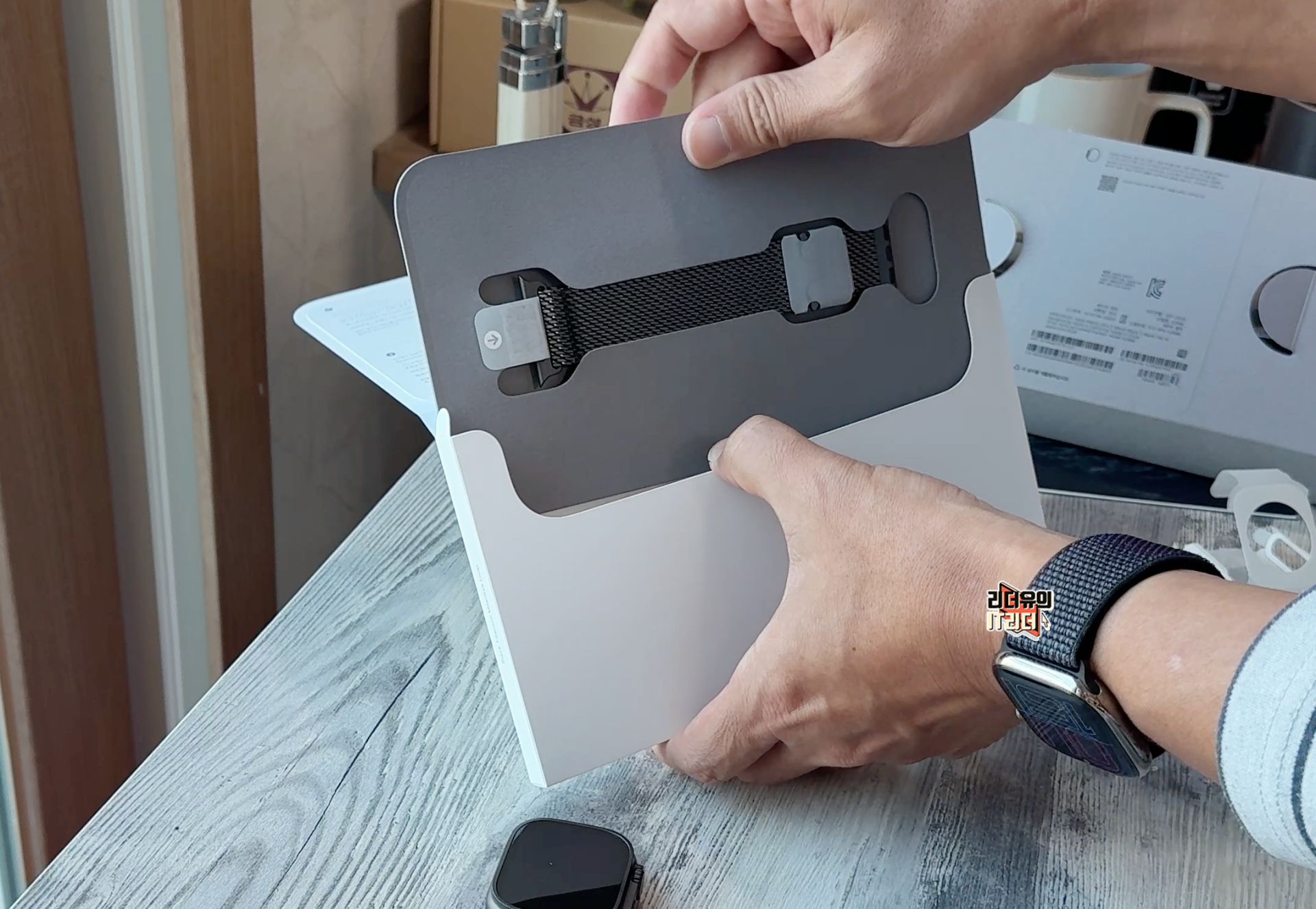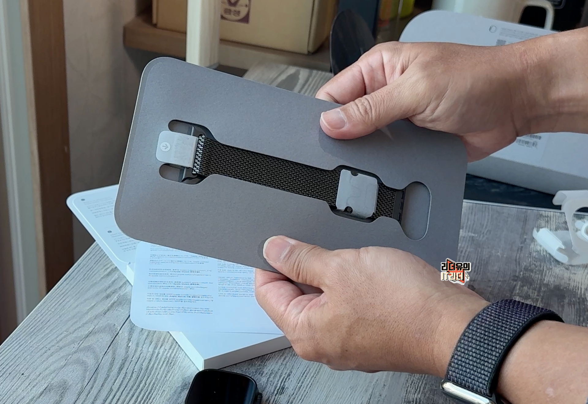 종이 보호지로 보호되고 있는 블랙 티타늄 밀레니즈 루프 밴드를 만날 수 있습니다. 놀라운 점은 무게가 정말 가볍다는 것입니다. 티타늄 소재를 사용해 무게를 획기적으로 줄였습니다.