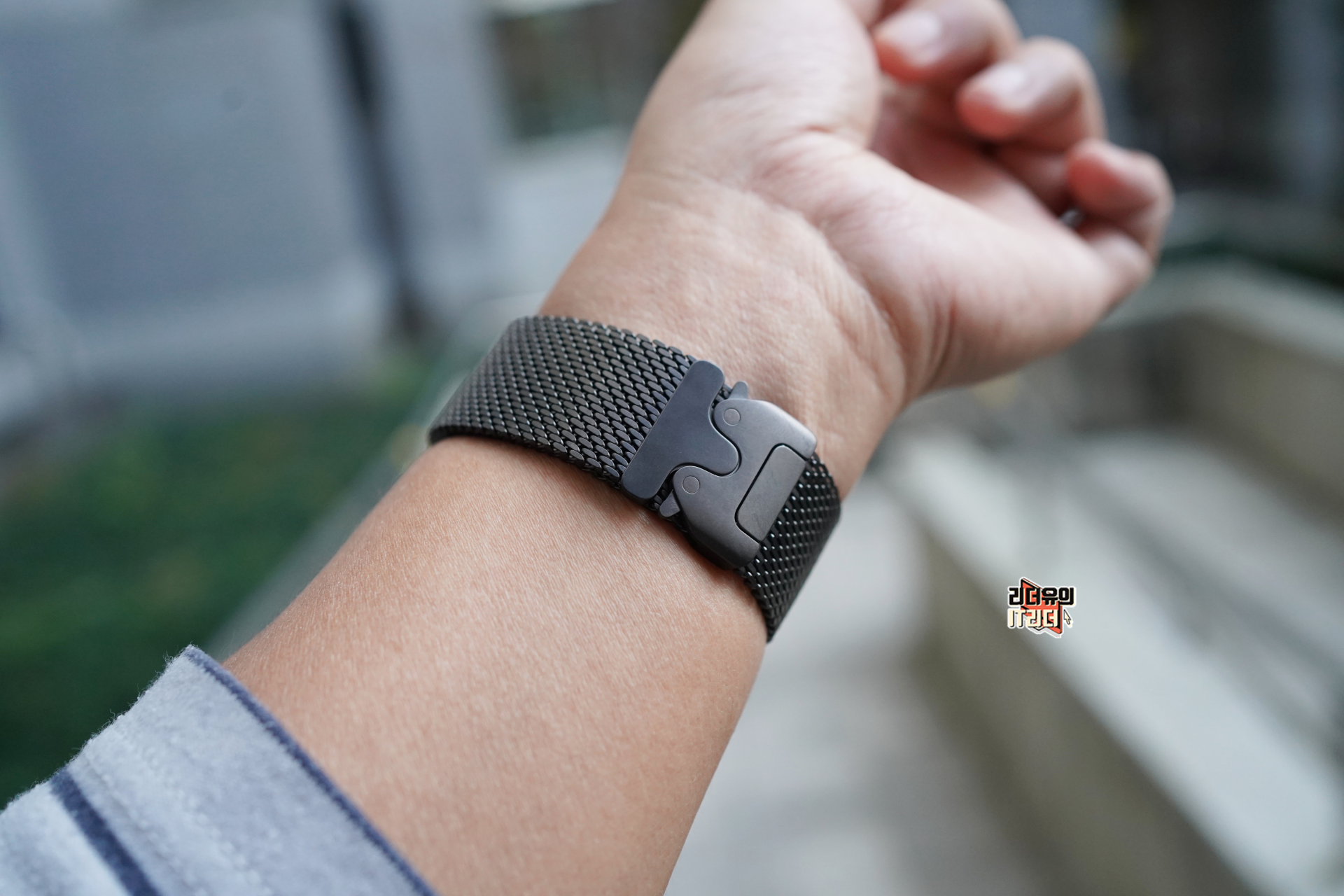 애플워치 울트라2 블랙과 티타늄 밀레니즈 루프 밴드 조합입니다. 애플워치 울트라2 블랙의 프레임도 티타늄 소재라 완벽하게 티타늄 밀레니즈 루프 밴드와 조합을 보여줍니다. 매트한 색상, 컬러 완전 일치합니다.
