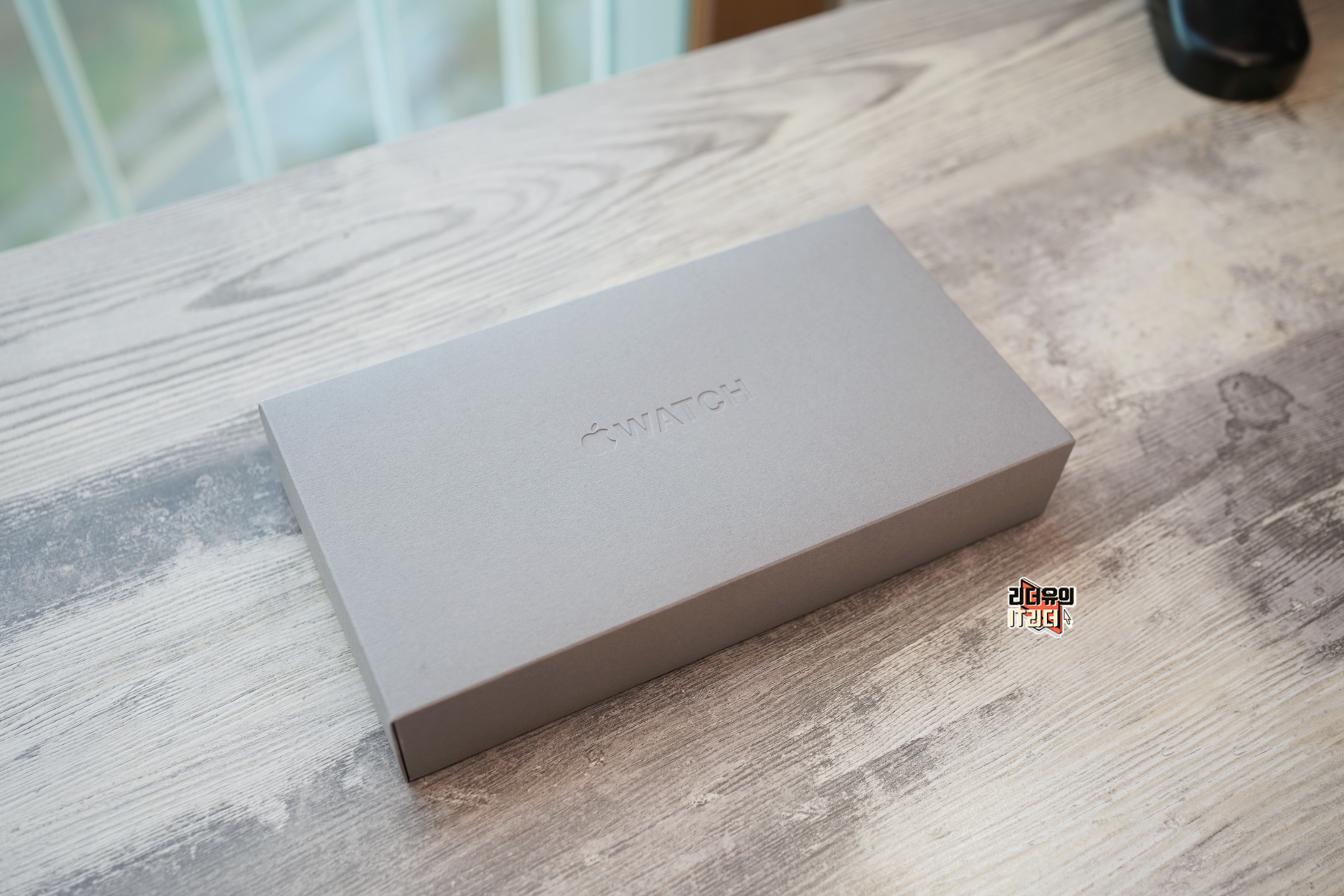 애플워치 울트라2 블랙은 패키지 부터 블랙의 새로움을 보여주는 다크 그레이 색상으로 되어 있습니다. 전면에는 음각으로 애플워치가 새겨져 있고 겉에 싸져 있는 종이는 밀봉되어 있지 않습니다.