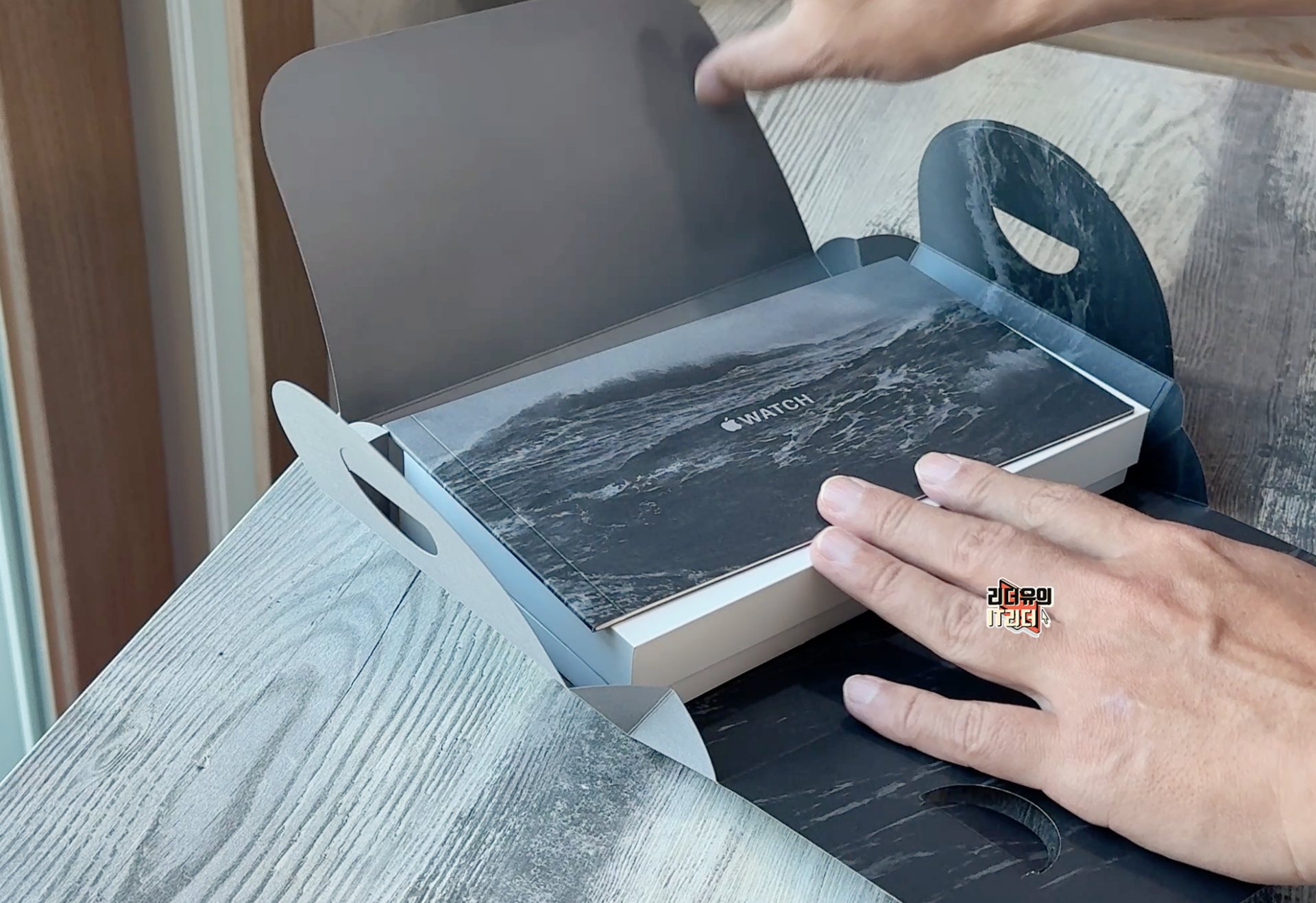 애플워치 울트라2 블랙은 패키지 부터 블랙의 새로움을 보여주는 다크 그레이 색상으로 되어 있습니다. 전면에는 음각으로 애플워치가 새겨져 있고 겉에 싸져 있는 종이는 밀봉되어 있지 않습니다.