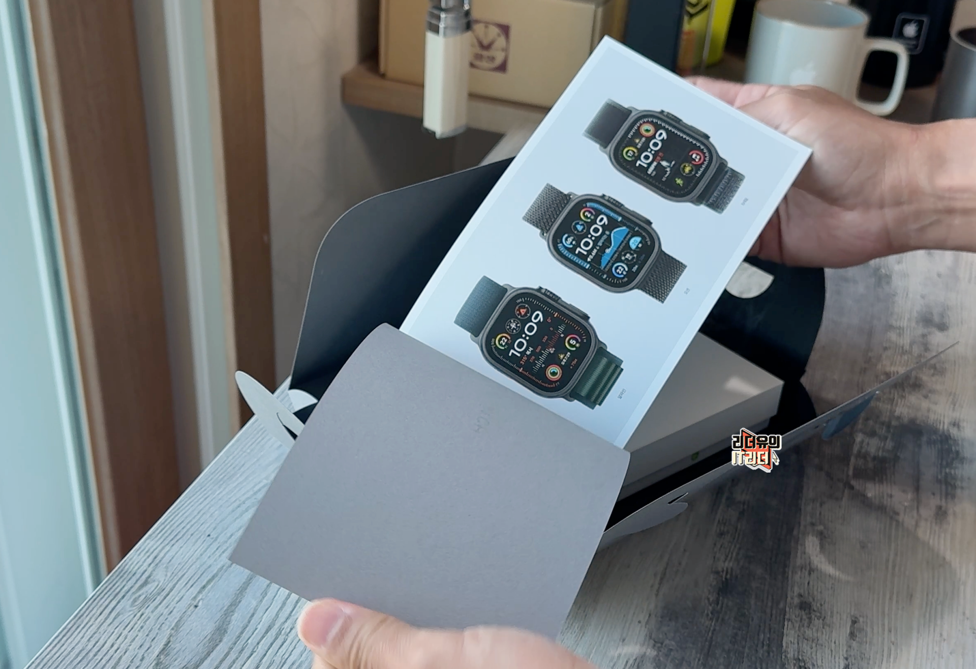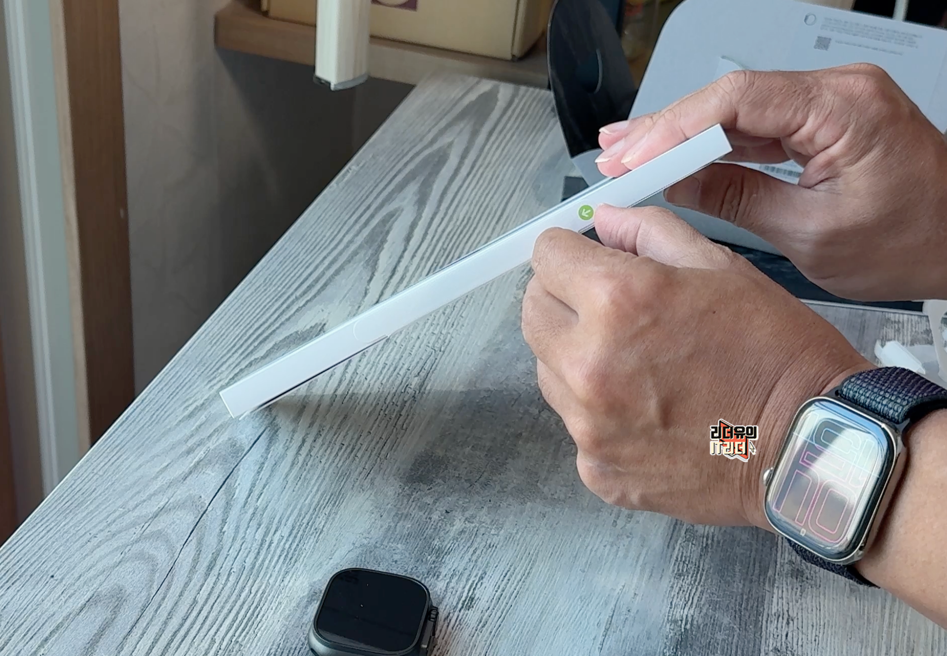 종이에 감싸진 애플워치 울트라2 본체와 그 옆에는 구성품으로 무선 충전 케이블이 들어 있습니다.