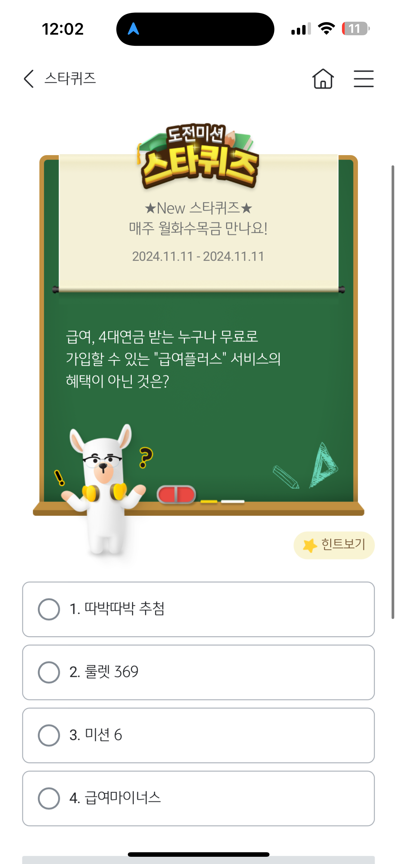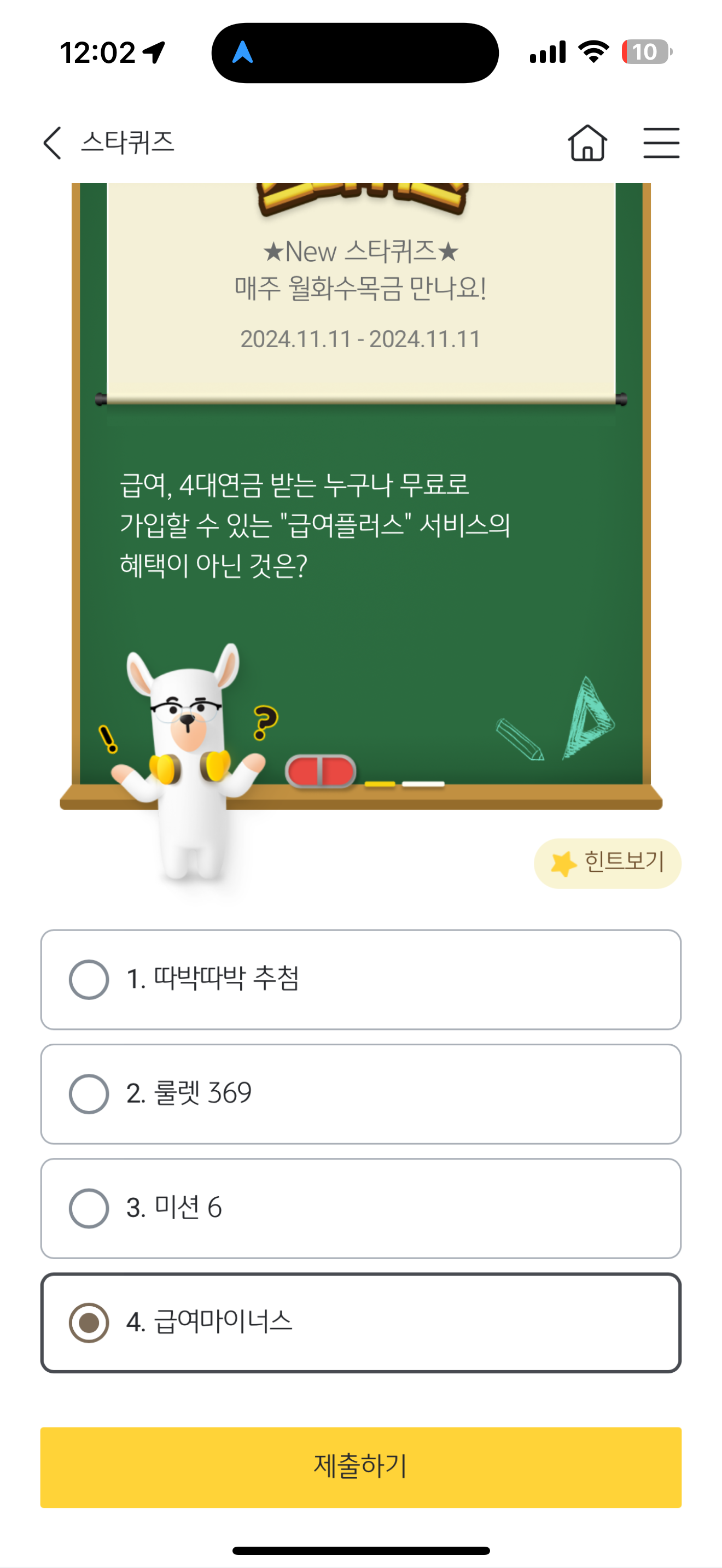 급여, 4대연금 받는 누구나 무료로 가입할 수 있는 "급여플러스" 서비스의 혜택이 아닌 것은? 보기는 1. 따박따박 추첨 2. 룰렛 369 3. 미션6 4. 급여마이너스 입니다. 급여, 4대연금을 받는 사람들은 필수로 가입하면 좋은 급여 플러스 서비스입니다. 소소한 행복을 만나 보세요