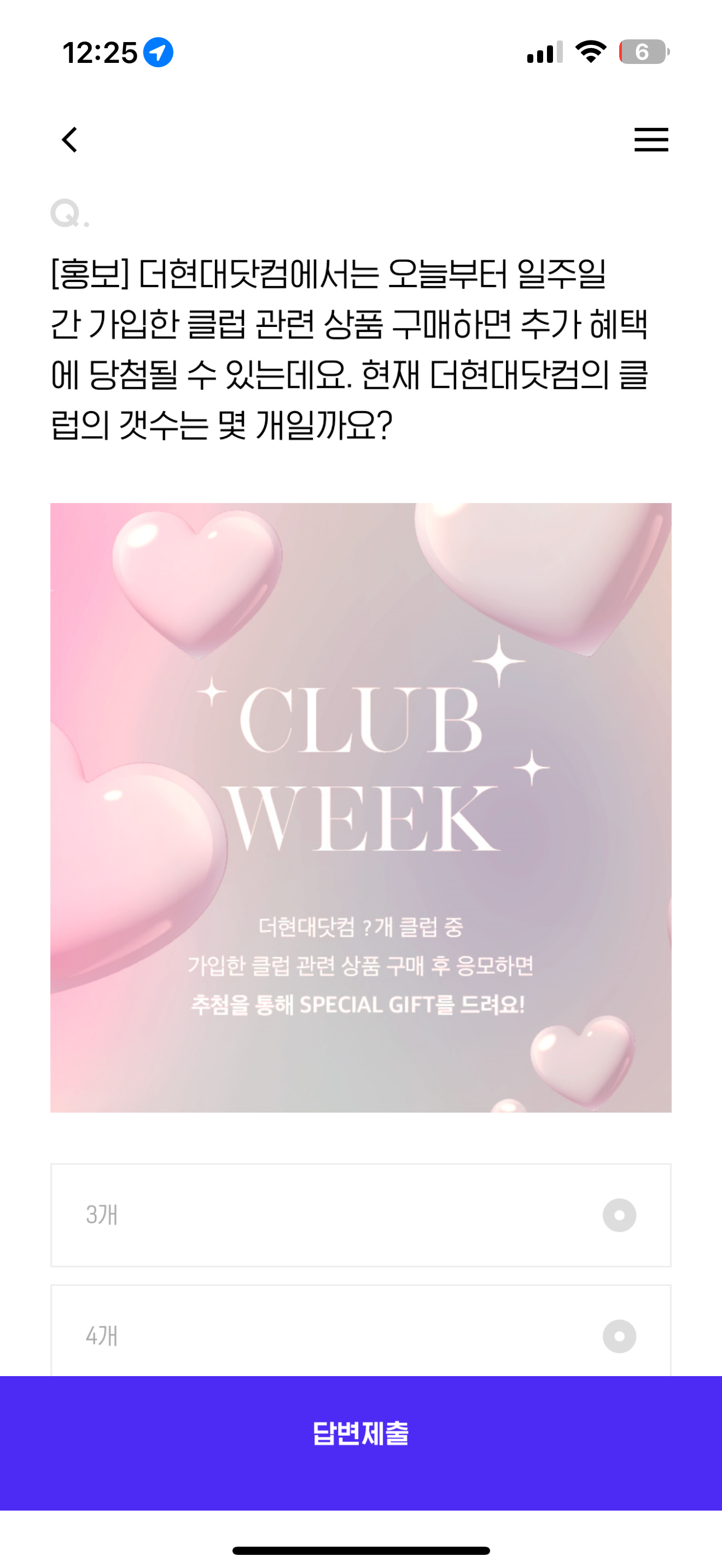 더현대닷컴에서는 오늘부터 일주일간 가입한 클럽 관련 상품 구매하면 추가 혜택에 당첨될 수 있는데요. 현재 더현대닷컴의 클럽의 갯수는 몇 개일까요? 보기는 1. 3개 2. 4개 3. 5개 4. 6개 입니다. 더현대닷컴은 다양한 종류별로 클럽을 구성하고 있습니다. 자신의 관심사를 잘 찾아 보세요