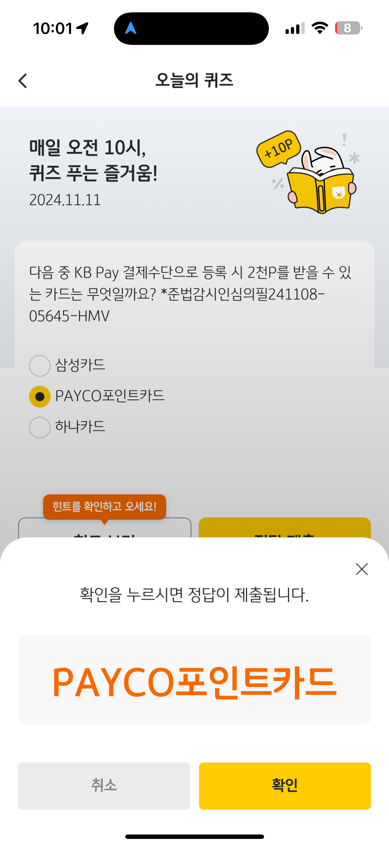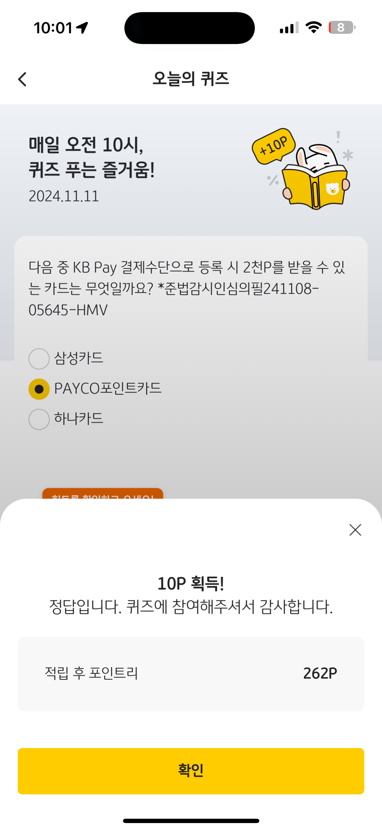 KB Pay 오늘의 퀴즈 정답은 PAYCO포인트카드 입니다