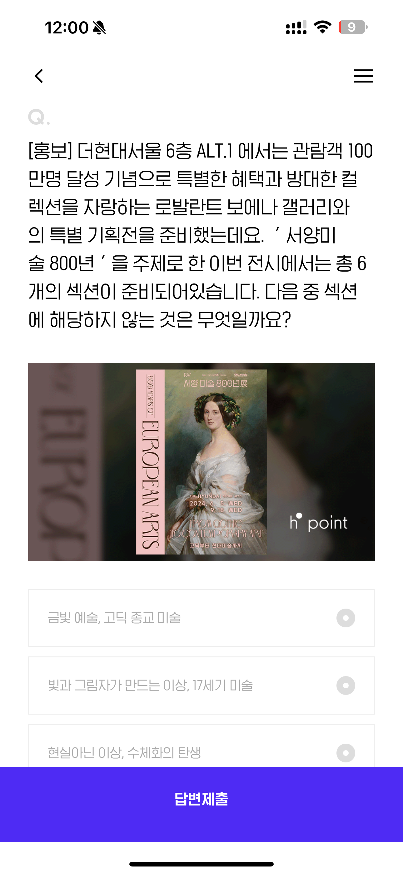 [홍보] 더현대서울 6층 ALT.1 에서는 관람객 100만명 달성 기념으로 특별한 혜택과 방대한 컬렉션을 자랑하는 로발란트 보에나 갤러리와의 특별 기획전을 준비했는데요. ' 서양미술 800년 ' 을 주제로 한 이번 전시에서는 총 6개의 섹션이 준비되어있습니다. 다음 중 섹션에 해당하지 않는 것은 무엇일까요? 보기는 1. 금빛 예술, 고딕 종교 미술 2. 빛과 그림자가 만드는 이상, 17세기 미술 3. 현실아닌 이상, 수체화의 탄생 4. 고전주의와 사실주의