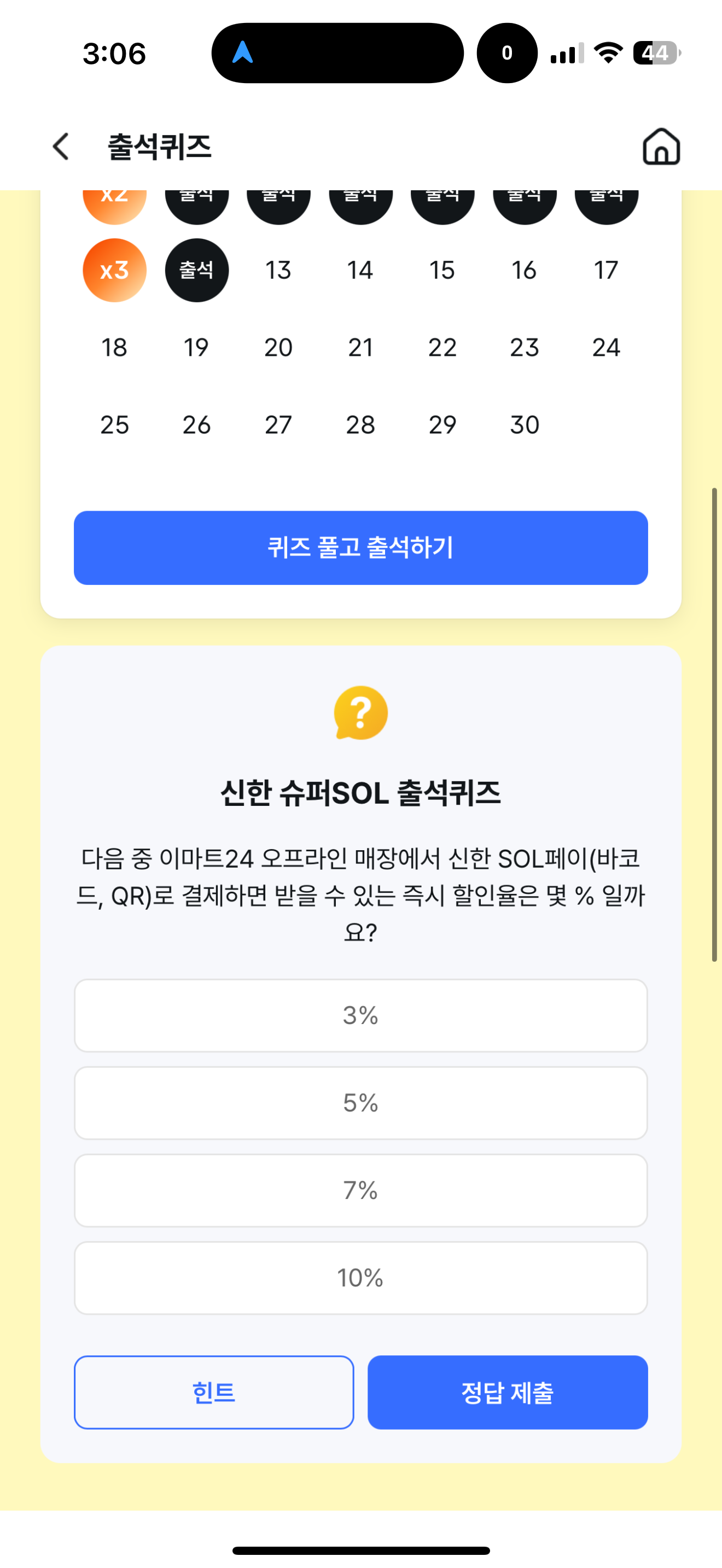 신한 슈퍼SOL 출석퀴즈 정답은 7% 입니다