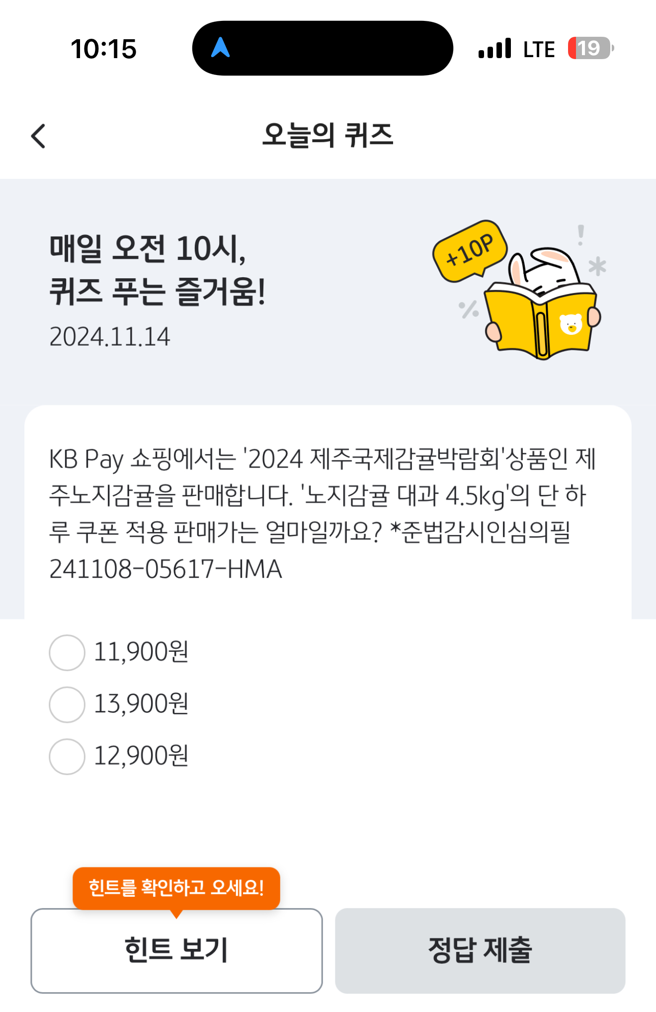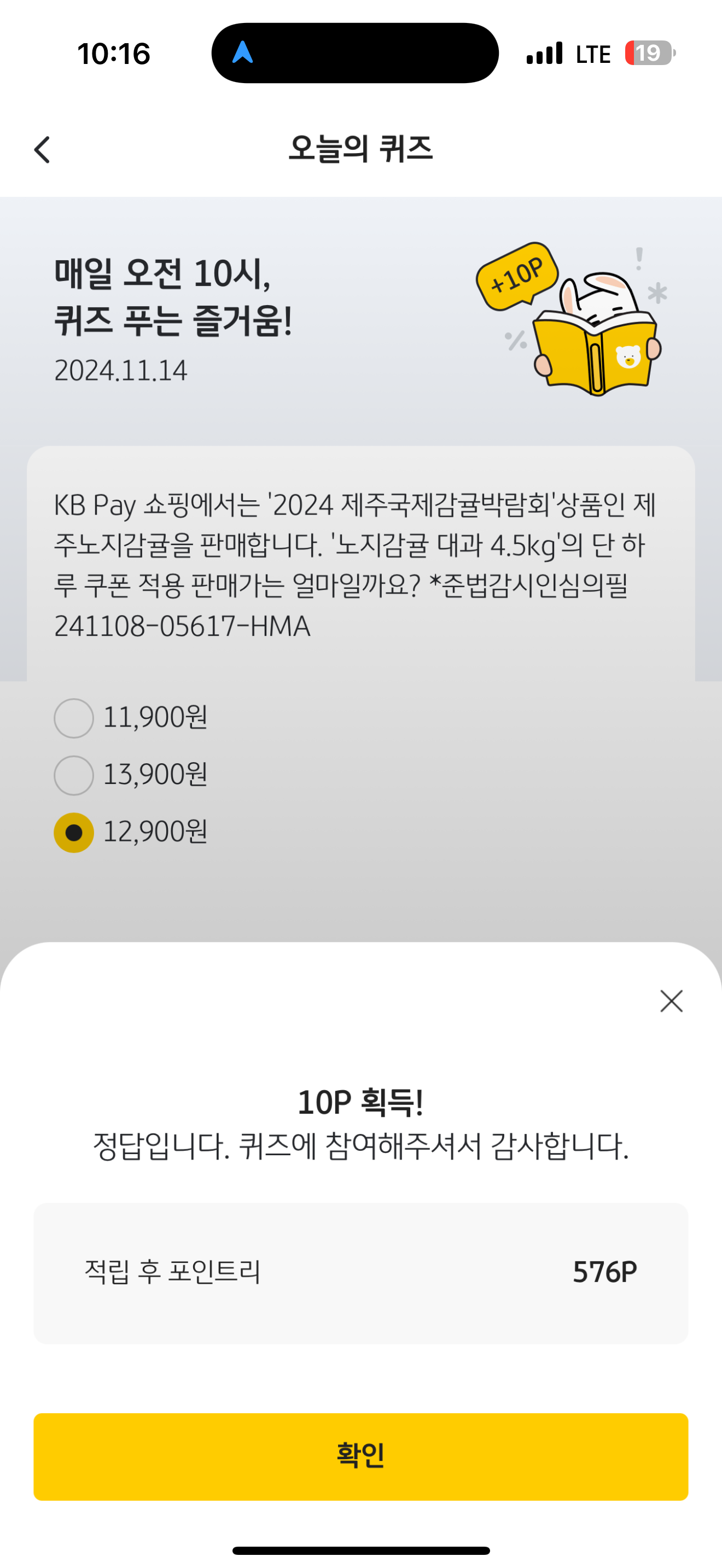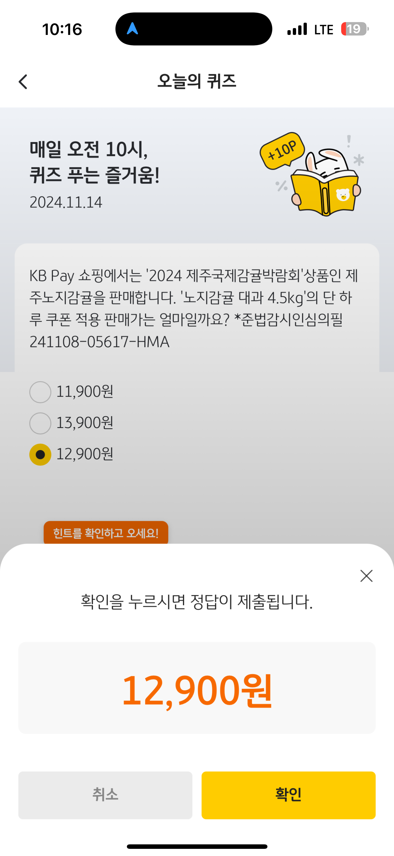 KB Pay 오늘의 퀴즈 정답은 12,900원 입니다