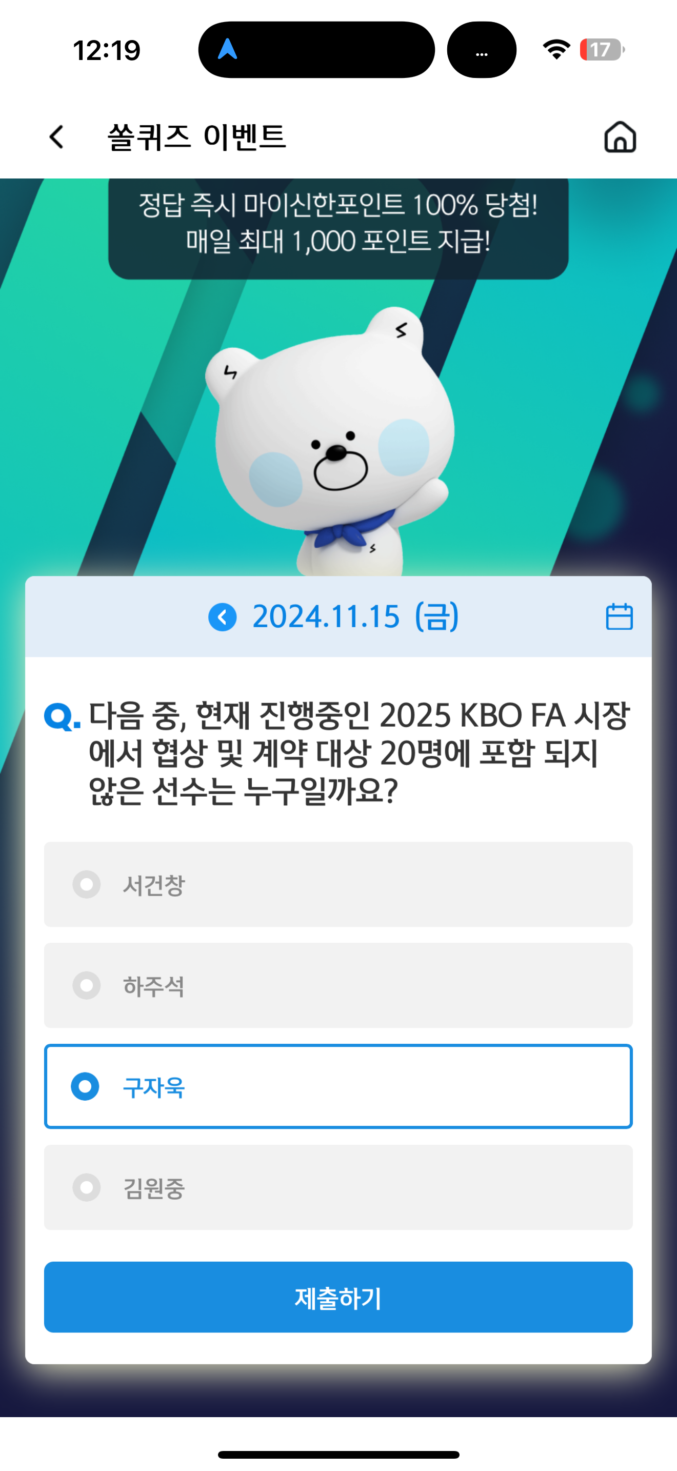 신한 슈퍼SOL 야구/상식 쏠퀴즈 11월 15일 정답(다음 중, 현재 진행중인 2025 KBO FA 시장에서 협상 및 계약 대상 20명에 포함 되지 않은 선수는 누구일까요?)