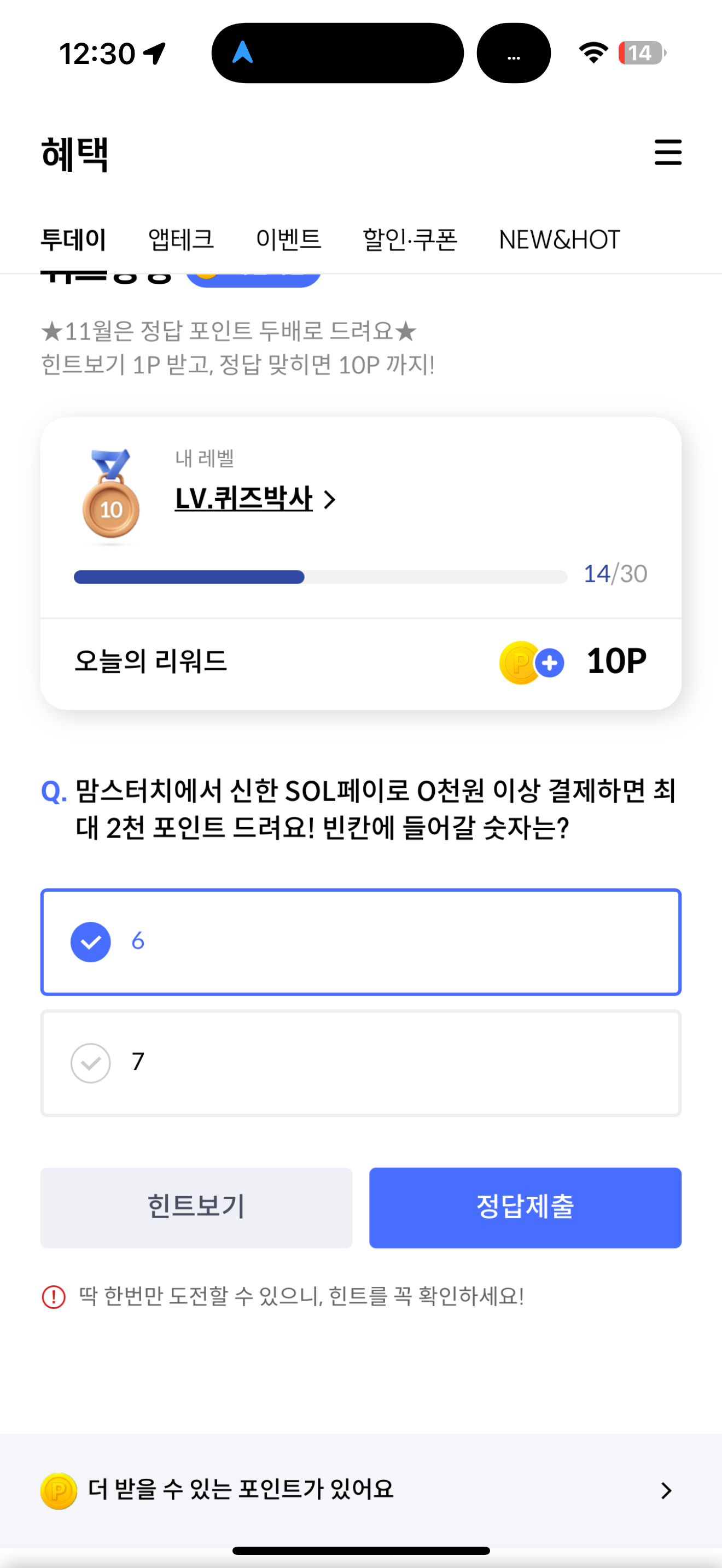 신한카드 퀴즈팡팡 정답은 6 입니다