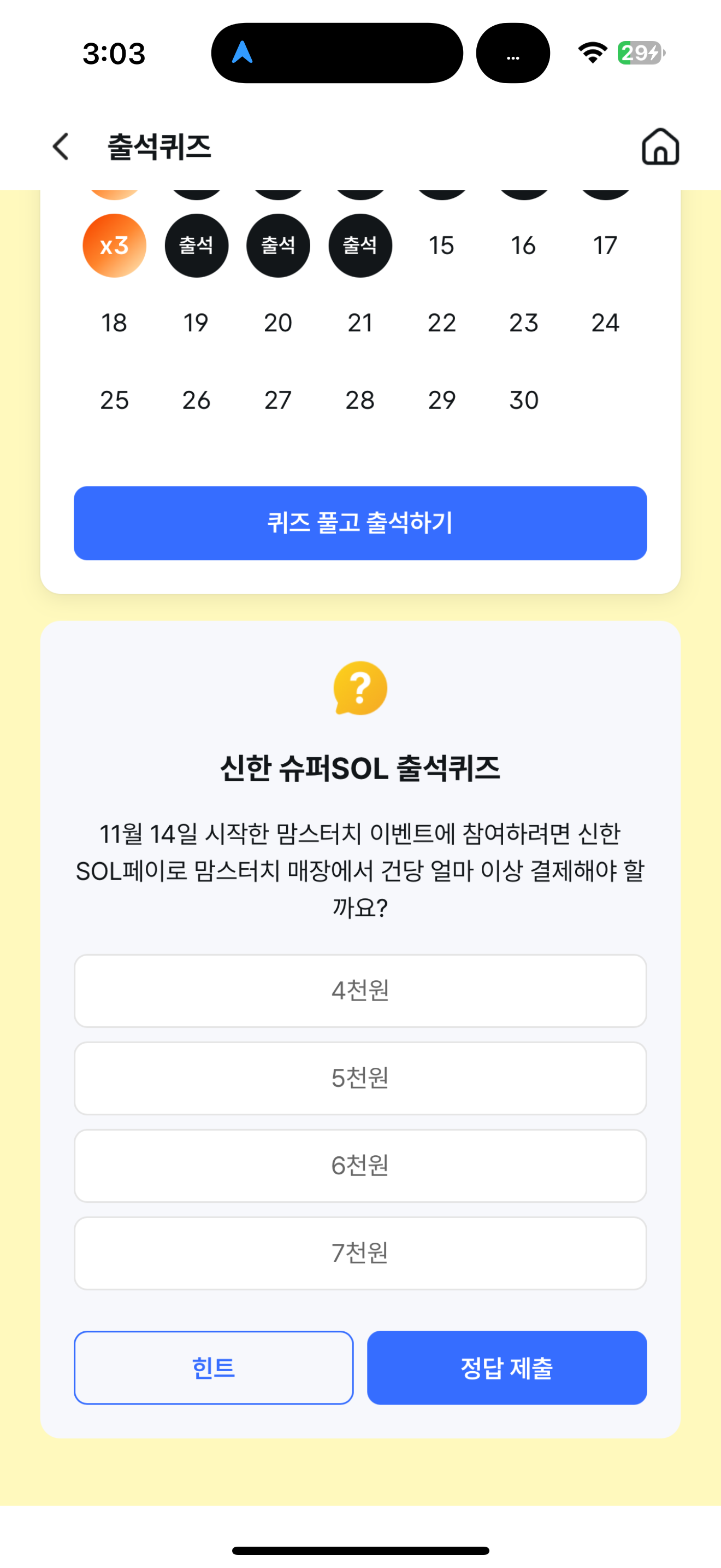 신한 SOL페이 출석퀴즈 정답은 6천원 입니다