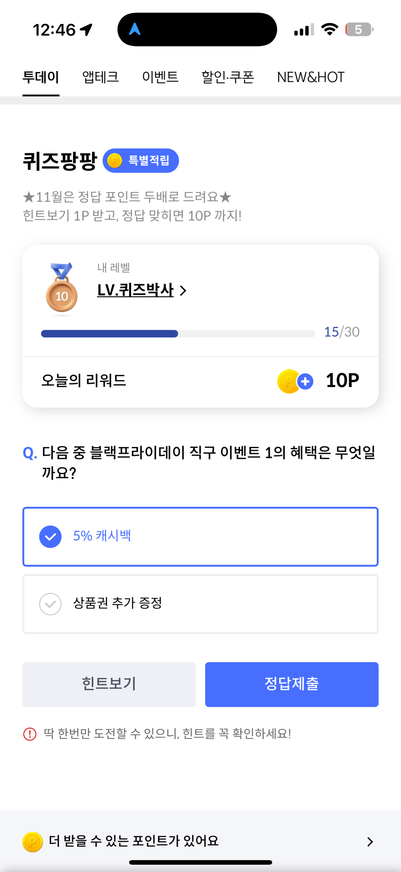 신한카드 퀴즈팡팡 정답은 5% 캐시백 입니다