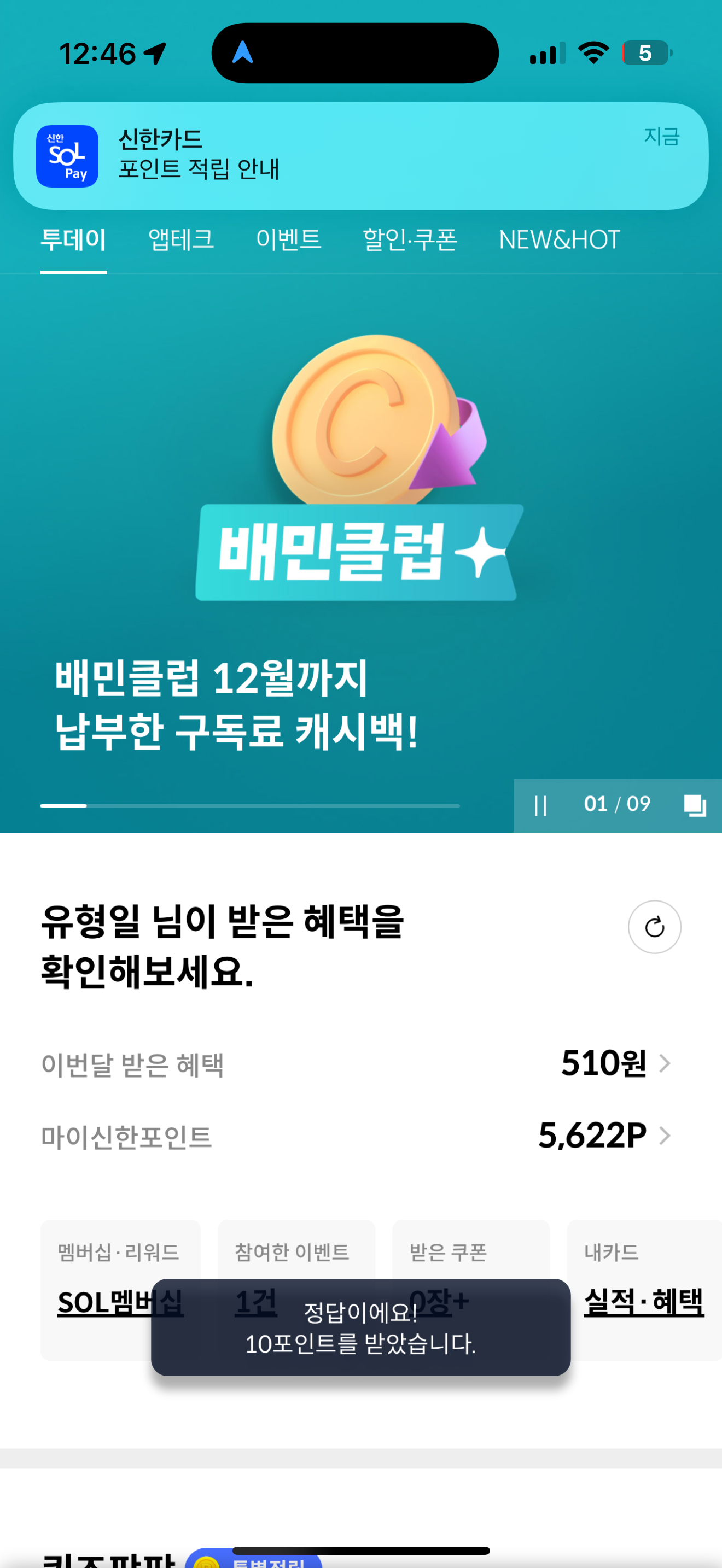 신한카드 퀴즈팡팡 정답은 5% 캐시백 입니다
