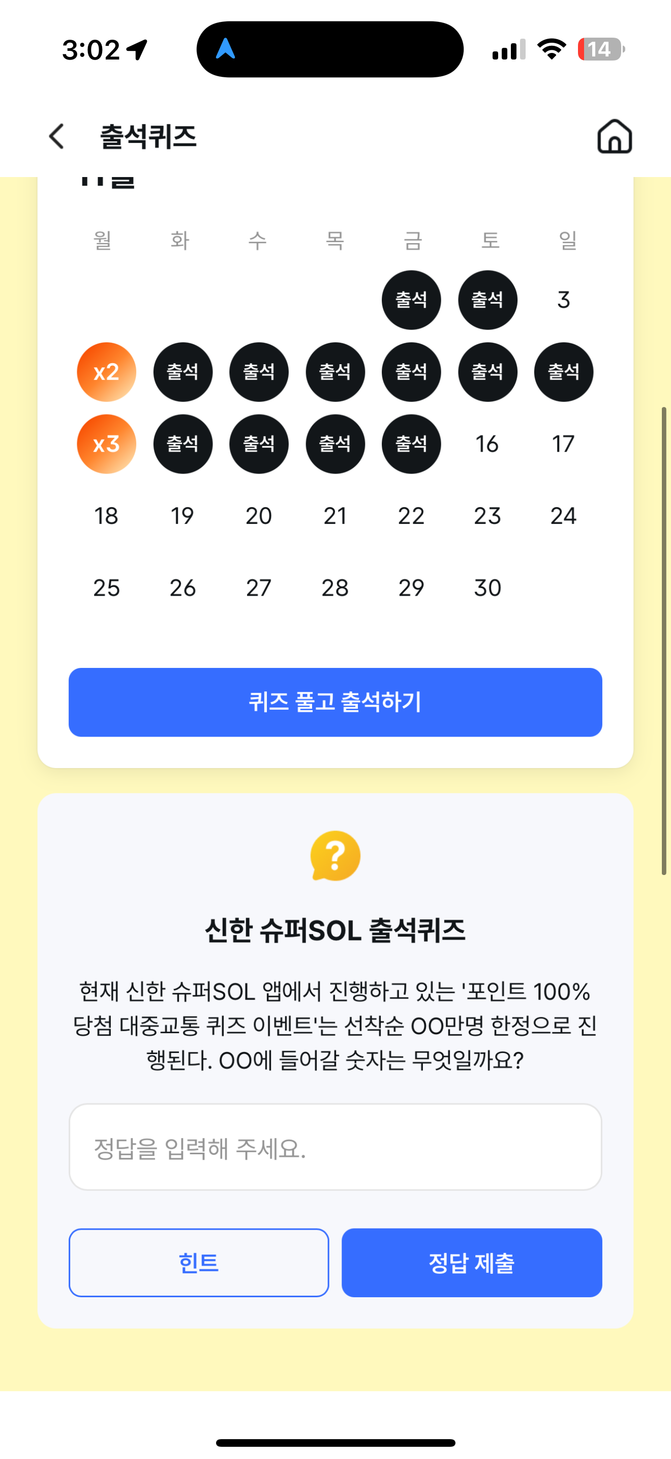 신한 슈퍼SOL 출석퀴즈 11월 16일 정답(현재 신한 슈퍼SOL 앱에서 진행하고 있는 '포인트 100% 당첨 대중교통 퀴즈 이벤트'는 선착순 OO만명 한정으로 진행된다)