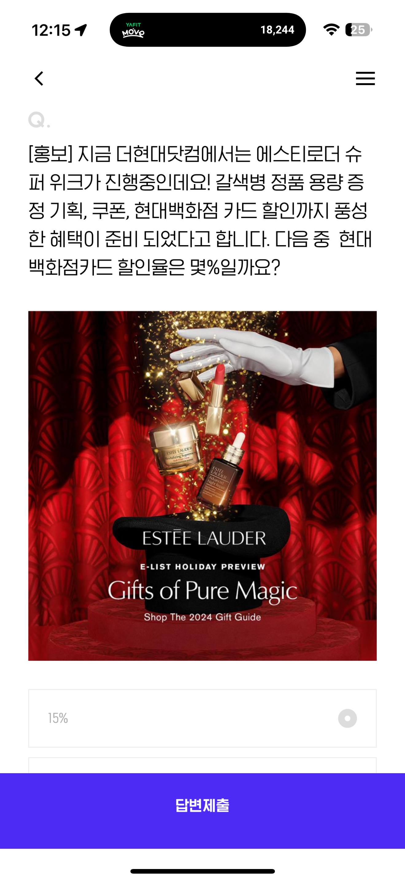 H포인트 퀴즈 11월 17일 정답(지금 더 현대닷컴에서는 에스티로더 슈퍼 위크가 진행중인데요! 갈색병 정품 용량 증정 기획, 쿠폰, 현대백화점 카드 할인까지 풍성한 혜택이 준비되었다고 합니다. 다음 중 현대백화점카드 할인율은 몇%일까요?)