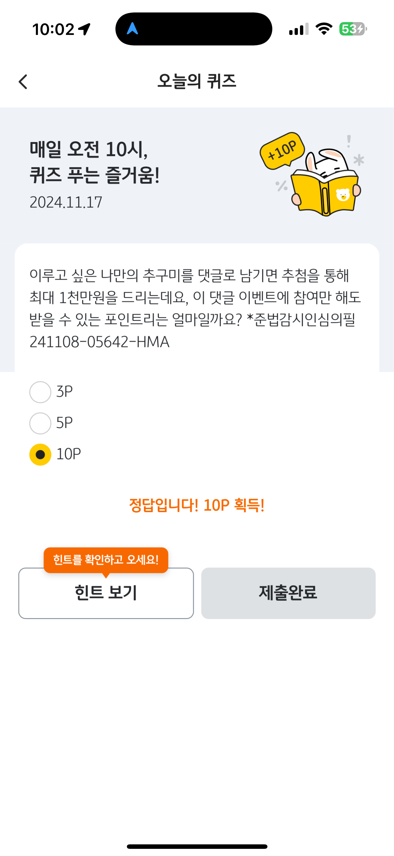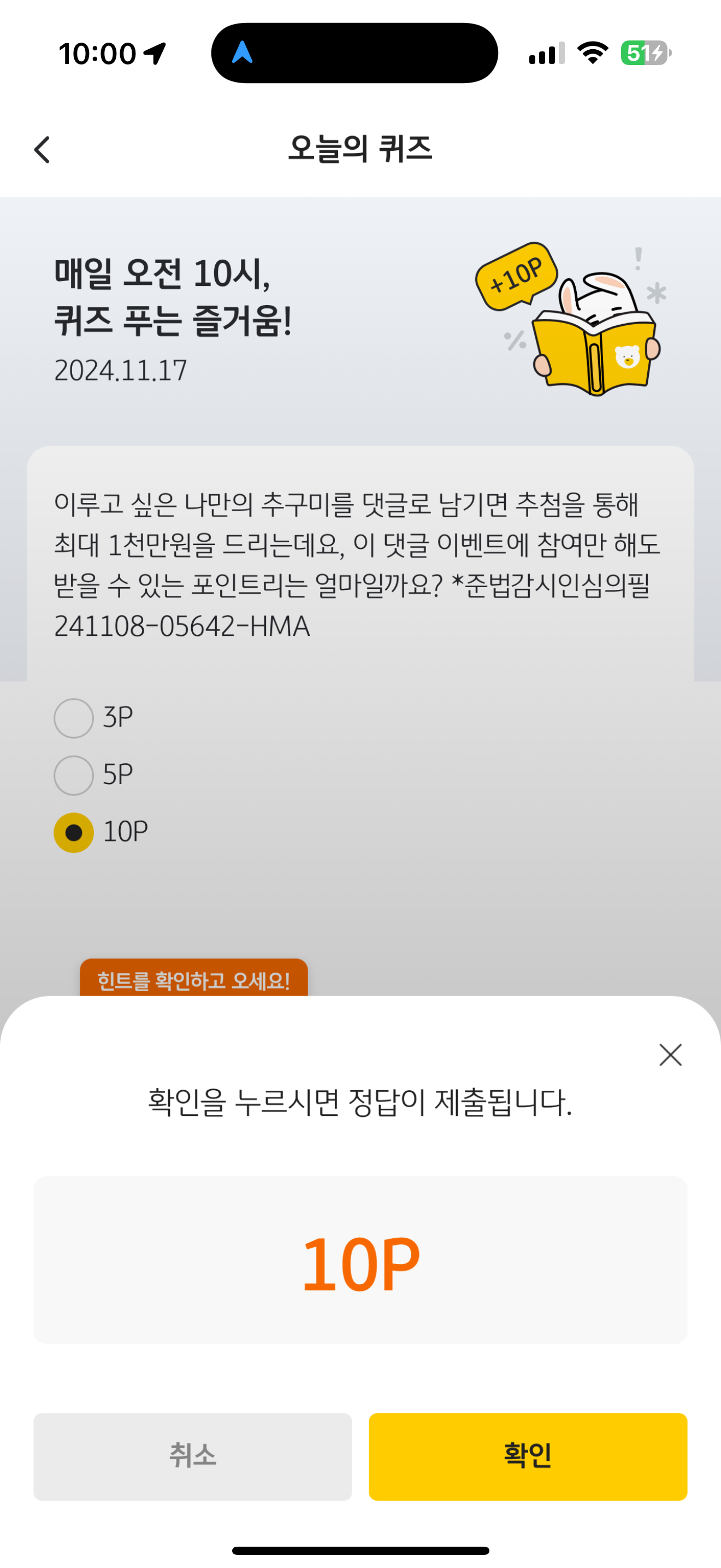 KB pay 오늘의 퀴즈 정답은 10P 입니다