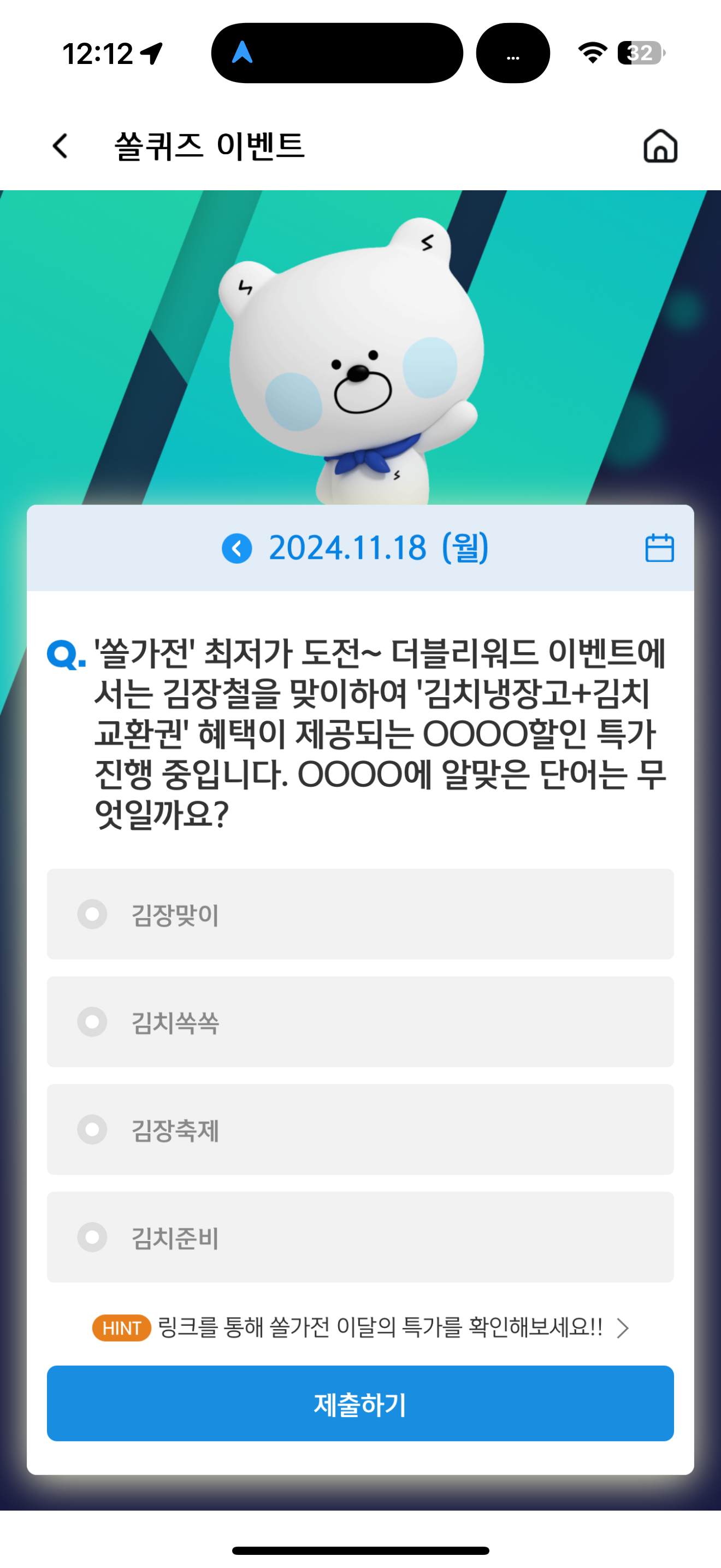 '쏠가전' 최저가 도전~ 더블리워드 이벤트에서는 김장철을 맞이하여 '김치냉장고+김치교환권' 혜택이 제공되는 OOOO할인 특가 진행 중입니다. OOOO에 알맞은 단어는 무엇일까요? 보기는 1. 김장맞이 2. 김치쑥쑥 3. 김장축제 4. 김치준비 입니다. 쏠가전 이달의 특가이니 참고해 두세요