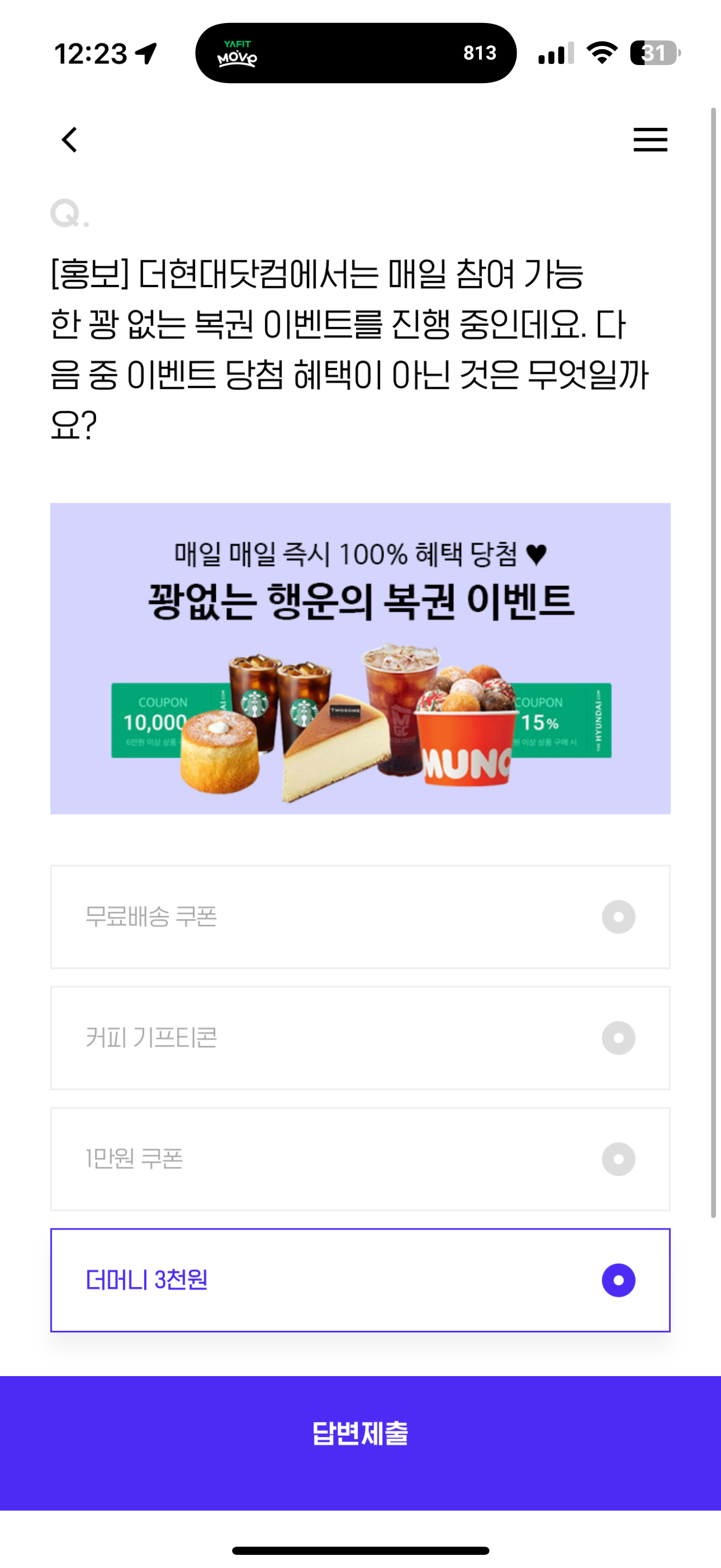 더현대닷컴에서는 매일 참여 가능한 꽝 없는 복권 이벤트를 진행 중인데요. 다음 중 이벤트 당첨 혜택이 아닌 것은 무엇일까요? 보기는 1. 무료배송 쿠폰 2. 커피 기프티콘 3. 1만원 쿠폰 4. 더머니 3천원 입니다. 더현대닷컴에서 꽝 없이 다 받을 수 있으니 잘 참고해서 도전해 보세요