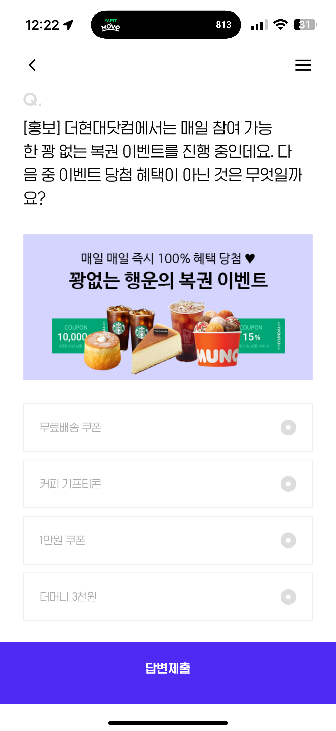 더현대닷컴에서는 매일 참여 가능한 꽝 없는 복권 이벤트를 진행 중인데요. 다음 중 이벤트 당첨 혜택이 아닌 것은 무엇일까요? 보기는 1. 무료배송 쿠폰 2. 커피 기프티콘 3. 1만원 쿠폰 4. 더머니 3천원 입니다. 더현대닷컴에서 꽝 없이 다 받을 수 있으니 잘 참고해서 도전해 보세요